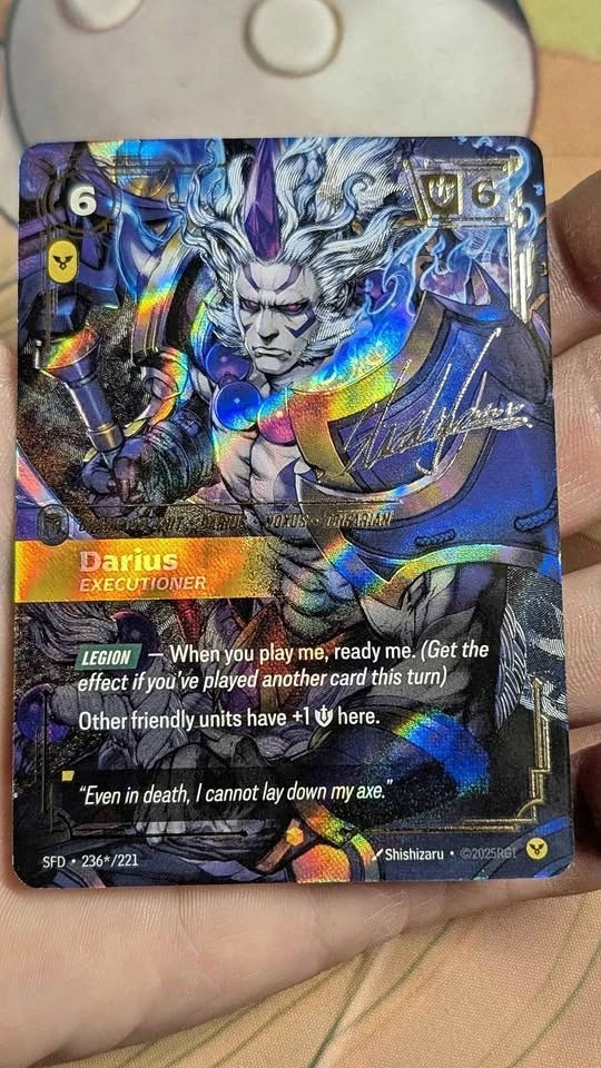 Sleeved immediately, mint / near mint. Darius - Executioner, Signature Overnumbered. I'm open to trades for sealed stuff (Mtg, Pokémon, Riftbound) or precious metals.