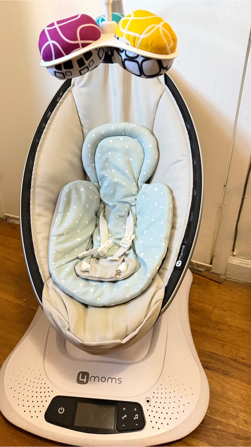 Selling a gently used 4moms MamaRoo baby swing. It has multiple motions and speeds to soothe your little one. The seat has a light blue polka dot pattern and there are colorful hanging toys. It's in great condition and ready for a new home!