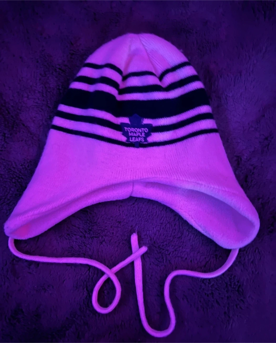 This knitted hat features bold black and white stripes and a classic Toronto Maple Leafs logo patch. It has ear flaps with ties to keep you extra warm. Perfect for showing your team spirit on a cold day!