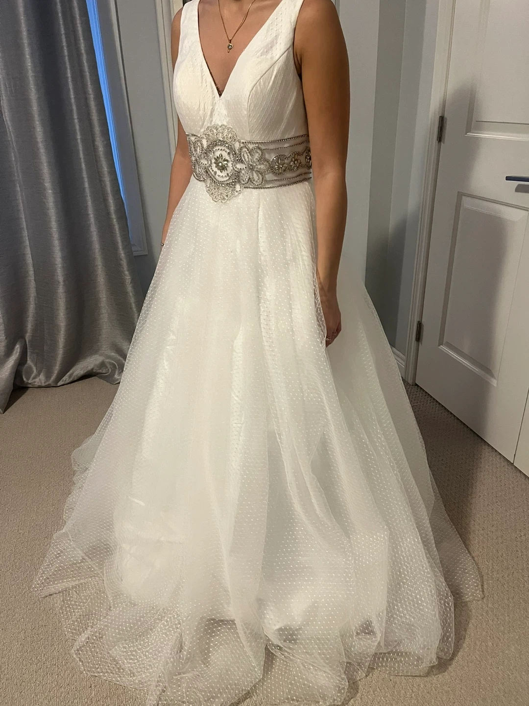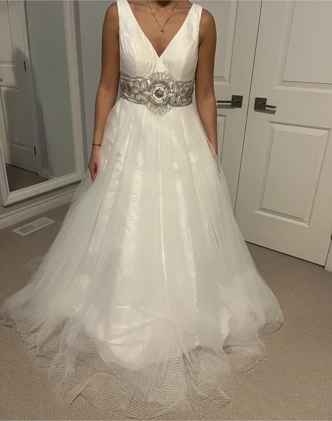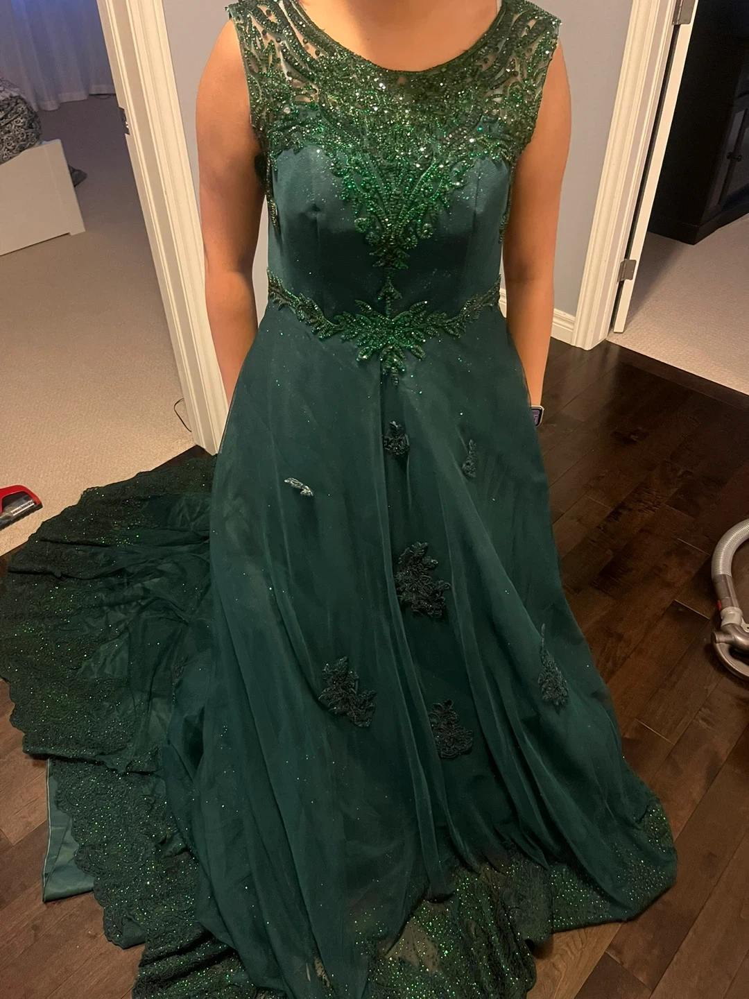 Emerald green formal gown with intricate beading and sequin details. It features a sleeveless design with a full skirt and train. This dress is perfect for special occasions like weddings or galas.