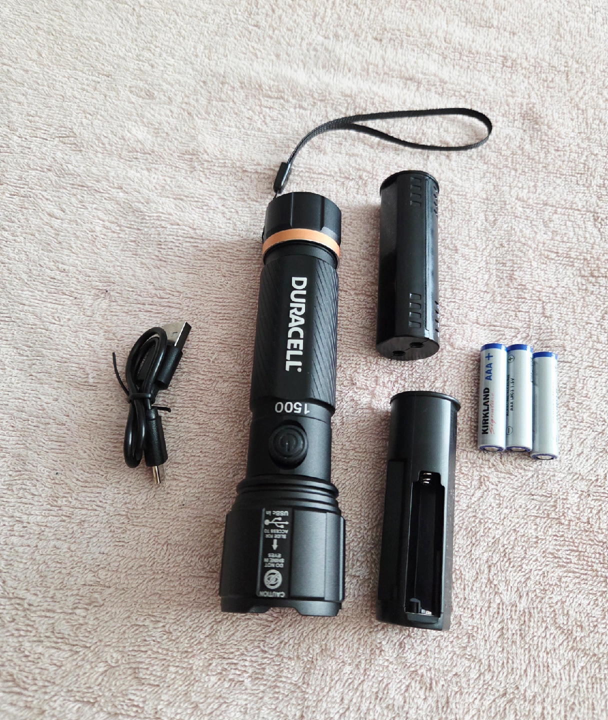 Selling Brand New Duracell Hybrid 1500 lumen LED flashlight. It features a zoom from high-intensity spot beam to wide flood large, and it's lightweight. It uses rechargeable or 3 AAA batteries and has a USB-C in for charging. Comes with 3 AAA and rechargeable Battery,Holding strap and Charging Cable. Kindly reach out if more info or pics are needed :)