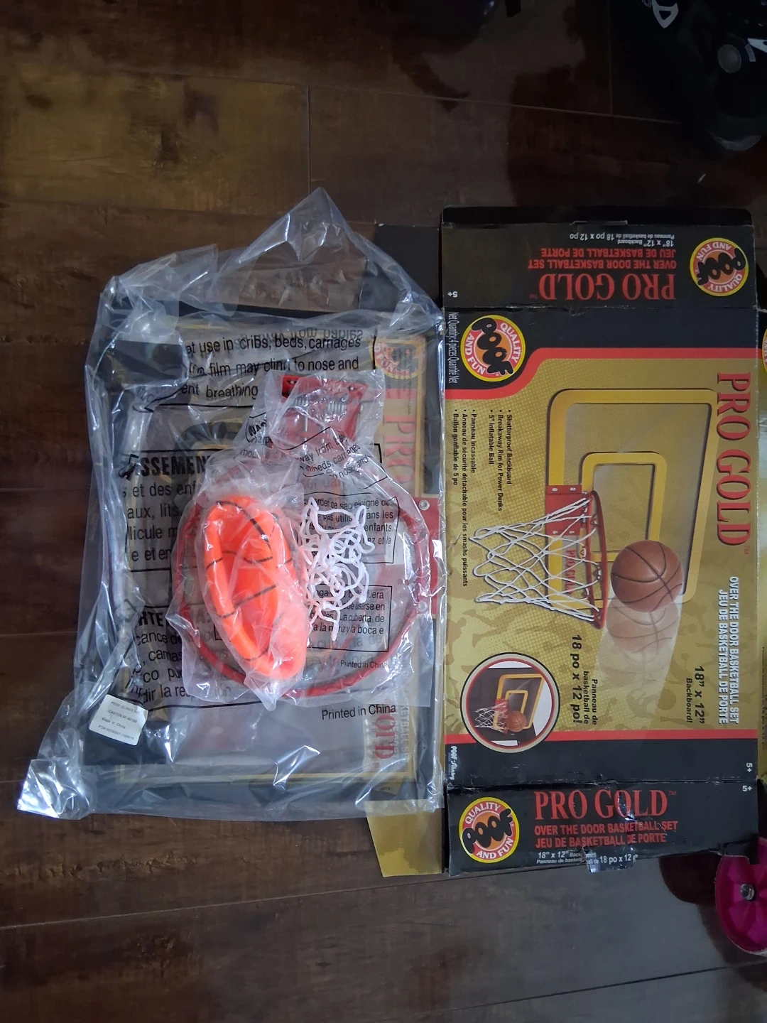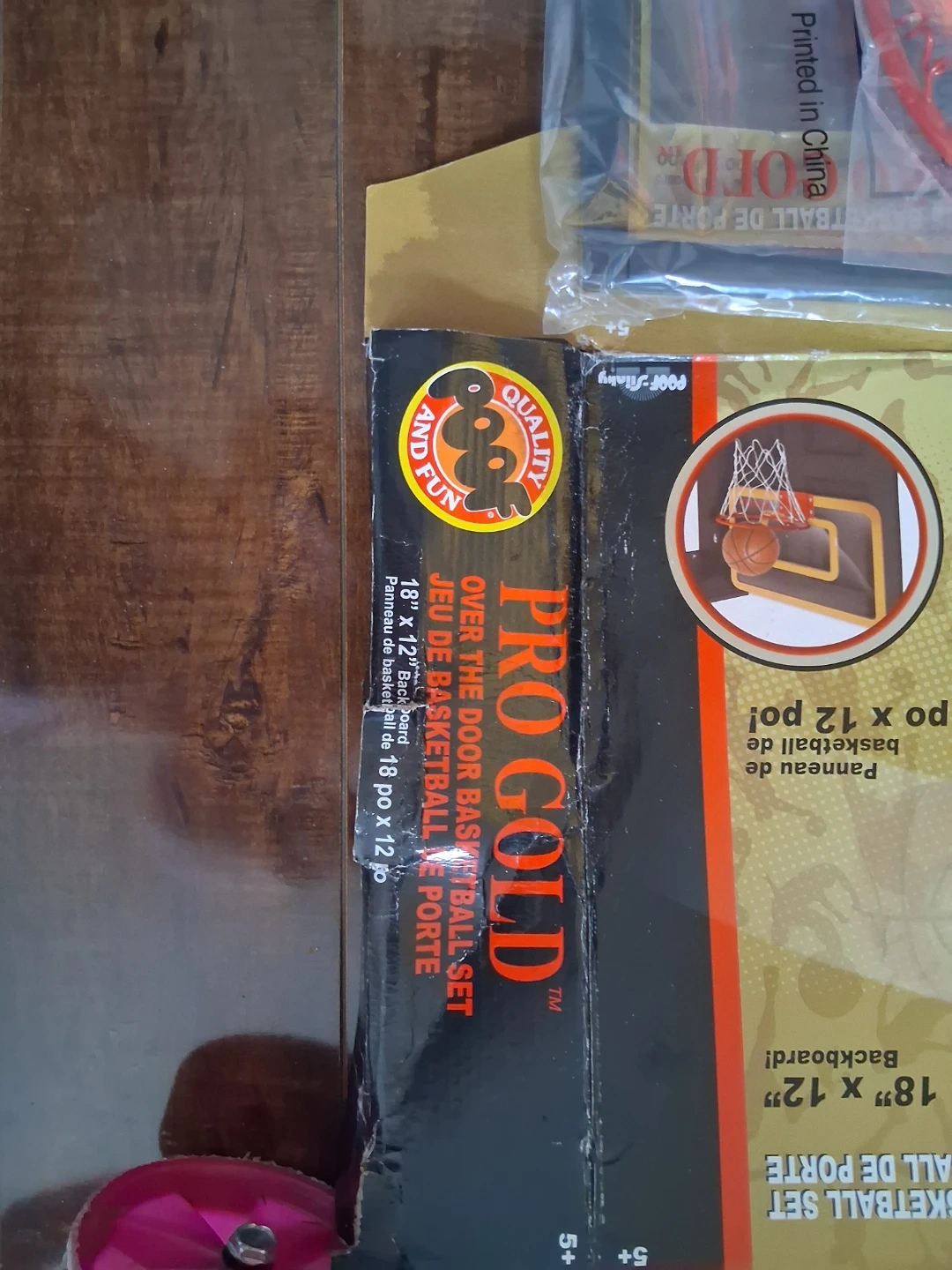 This Pro Gold basketball set is designed to hang over a door. It includes a backboard measuring 18" by 12" and a basketball. Great for indoor fun! Brand new