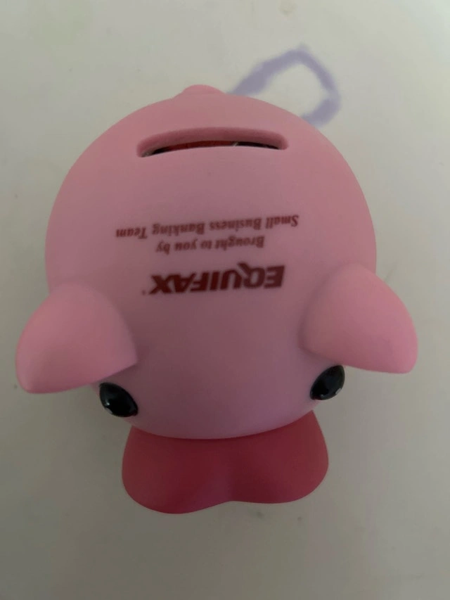 This mini Equifax piggy bank is adorable and a great way to start saving! It’s pink, compact, and already has some pennies to get you started. It's in good condition, ready for a new home. Perfect for kids or anyone who loves a cute way to save their change. If the ad is up, the piggy bank is still available, ready to embark on a new adventure with you!