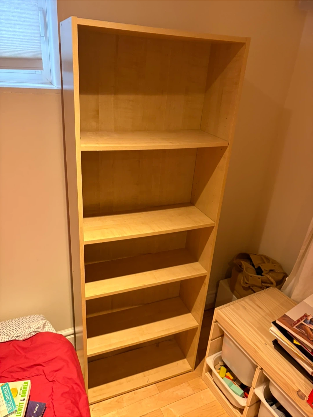 This is a tall, five-shelf bookshelf. It's made of light-coloured wood with a natural grain. Ample storage for books or decor! I believe it’s the ikea Billy book shelf.