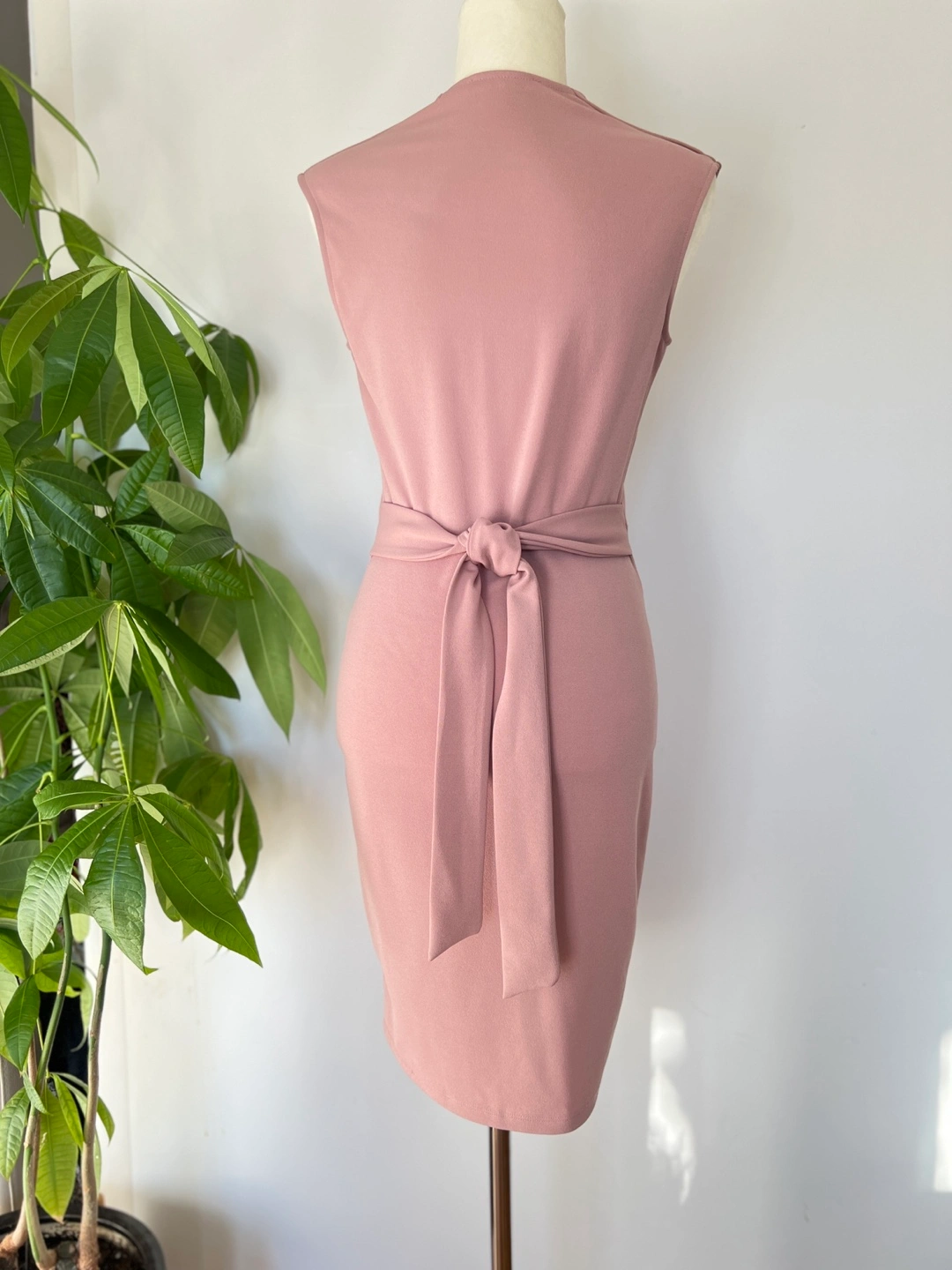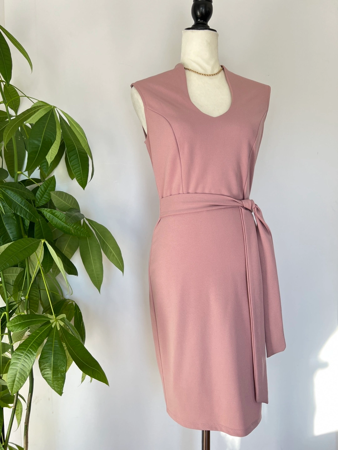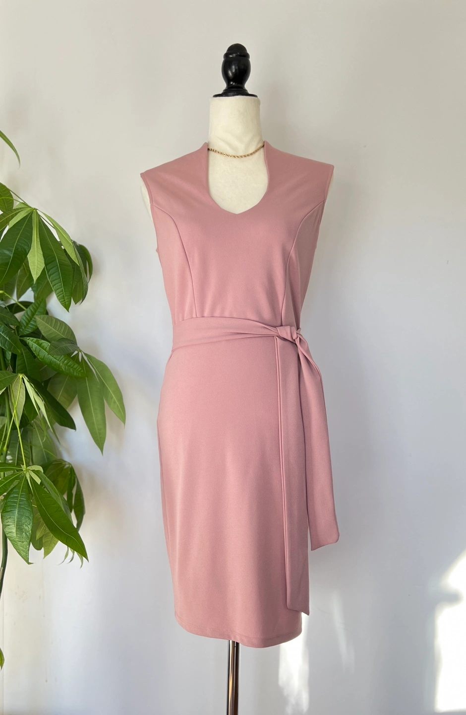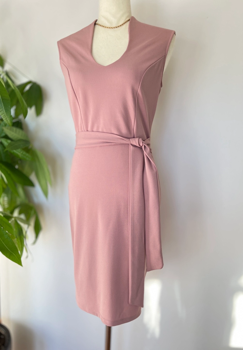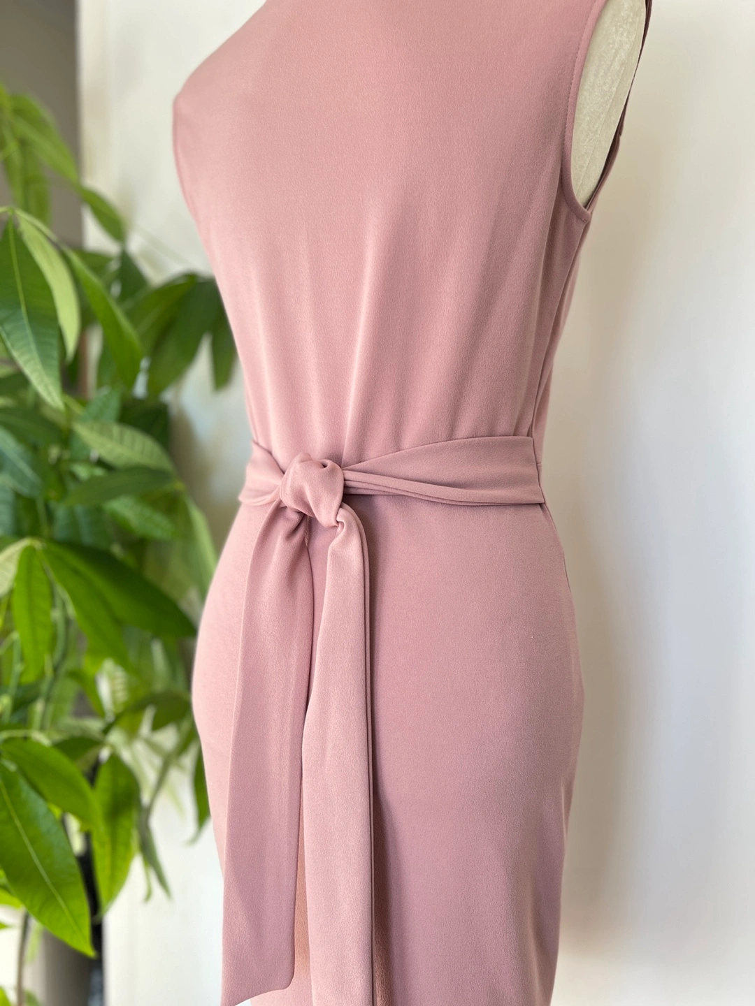 Elegant dusty rose mini dress. Features a V-neckline, sleeveless design, and a self-tie belt. Fitted silhouette. Perfect for a variety of occasions.
