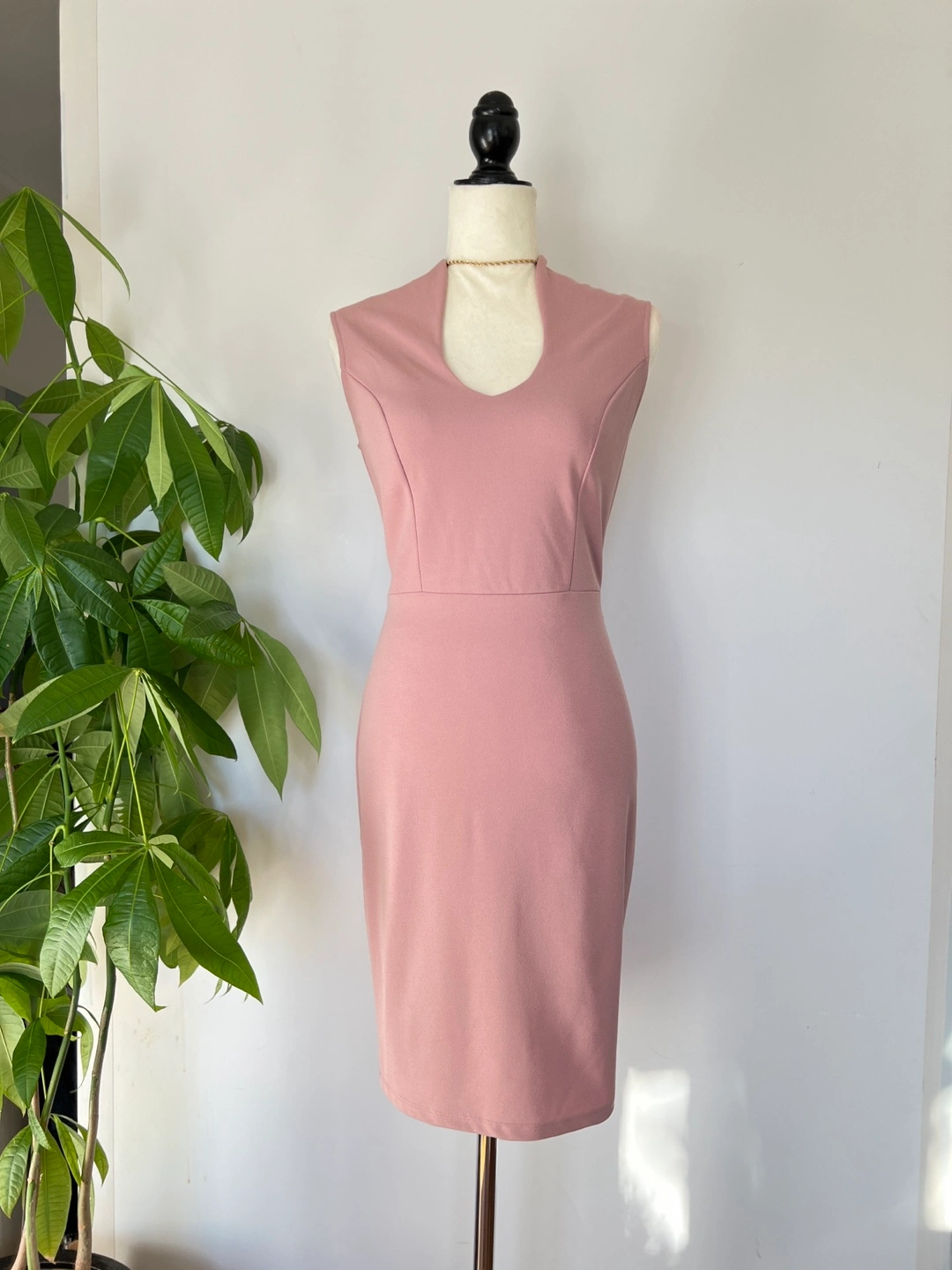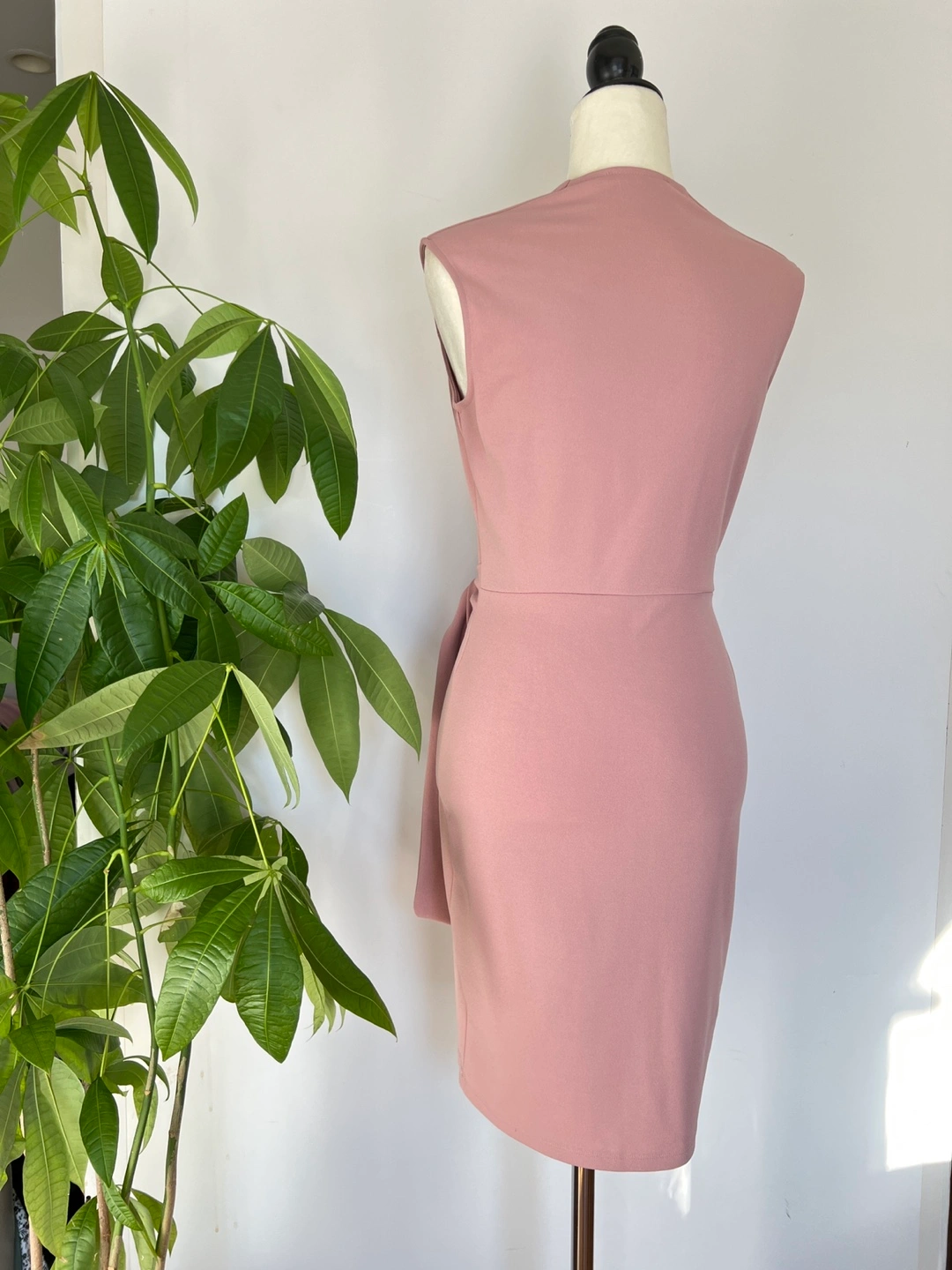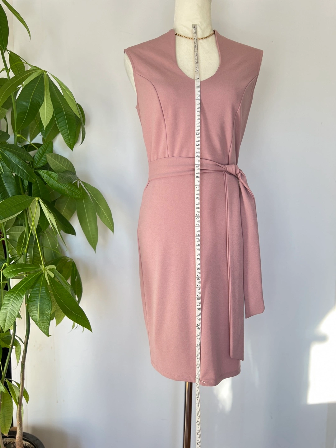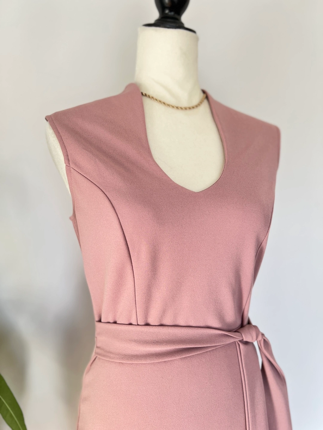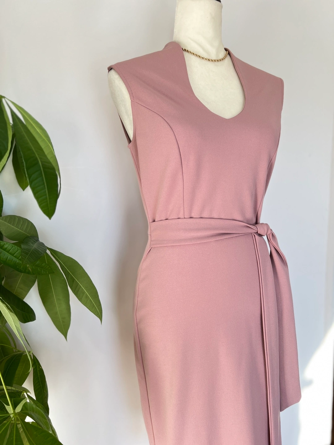 Elegant dusty rose mini dress. Features a V-neckline, sleeveless design, and a self-tie belt. Fitted silhouette. Perfect for a variety of occasions.