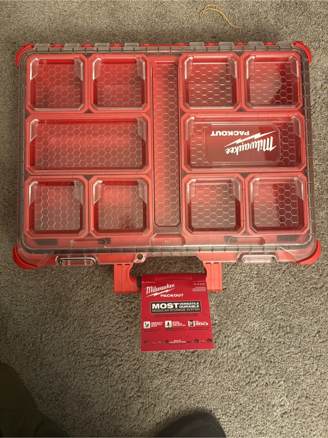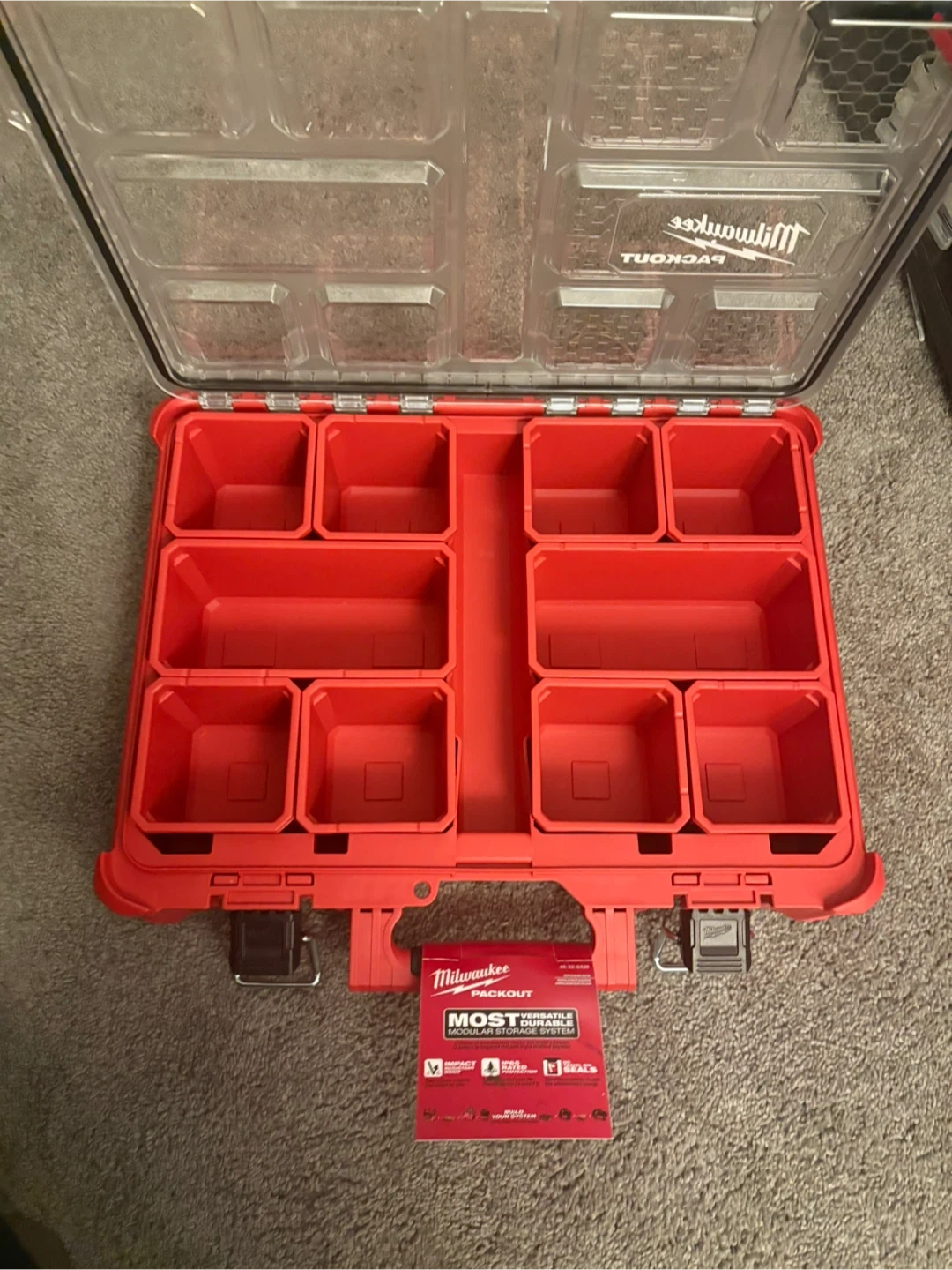 This is a brand new Milwaukee PACKOUT organizer. It's red and clear with multiple compartments and has never been used . It's designed for small parts storage and is part of a modular system. Great for keeping your workshop tidy!