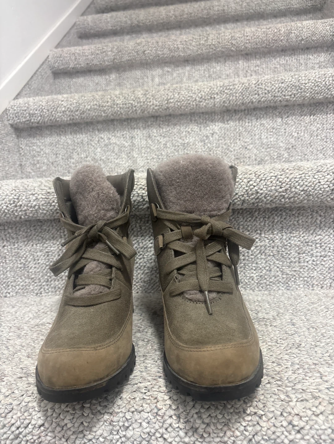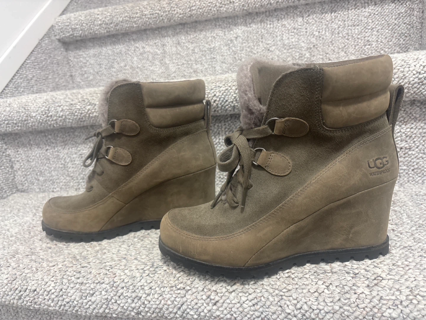 These UGG boots are waterproof with a warm shearling lining. They feature a convenient lace-up front and a stylish wedge heel. Perfect for staying cozy and dry during colder weather! Size 7.5 pick up cash only