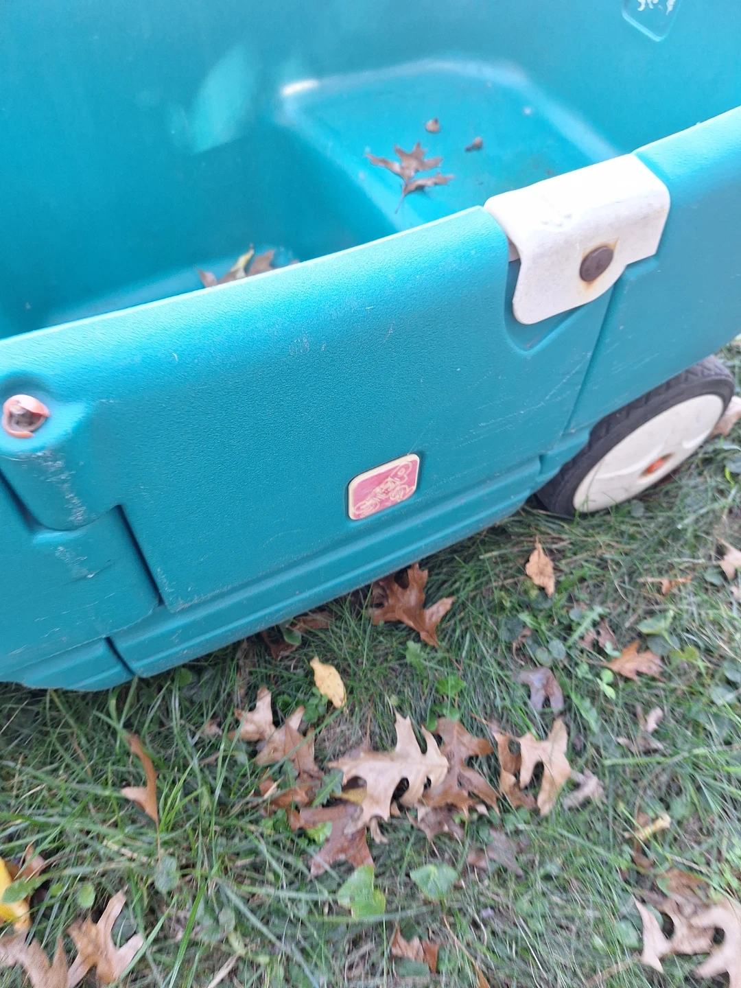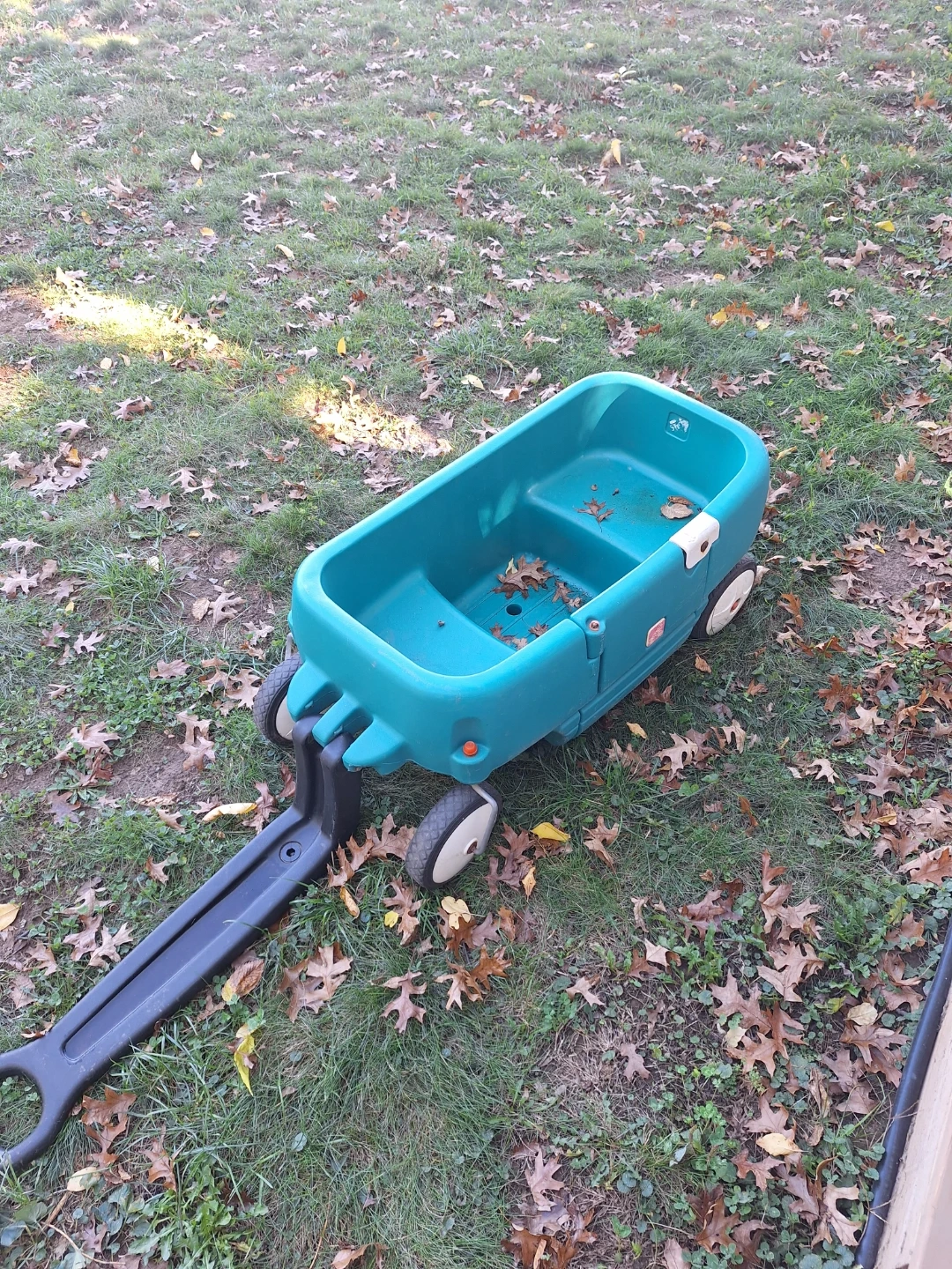 This is a teal Step2 wagon. It's made of durable plastic and has a large hauling capacity. It's great for kids to use for playing or helping with small tasks!