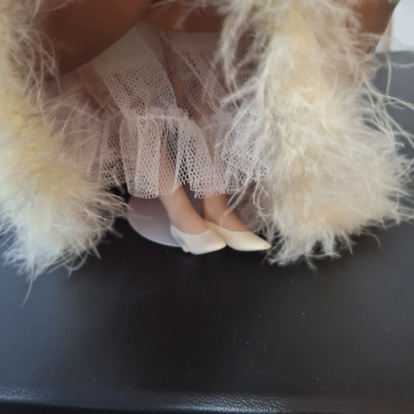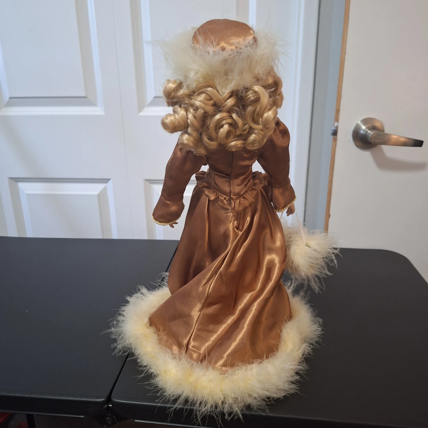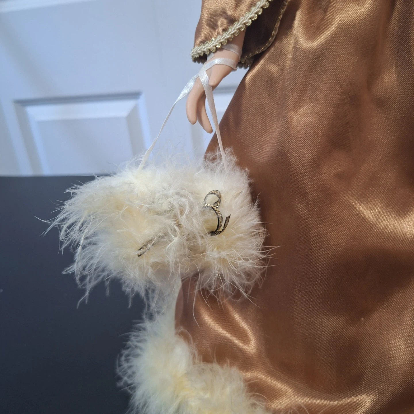 This collectible porcelain doll is dressed in a satin gown with faux fur trim. She has blonde curly hair and is holding a small, fluffy handbag. It's a decorative piece for any collector.
