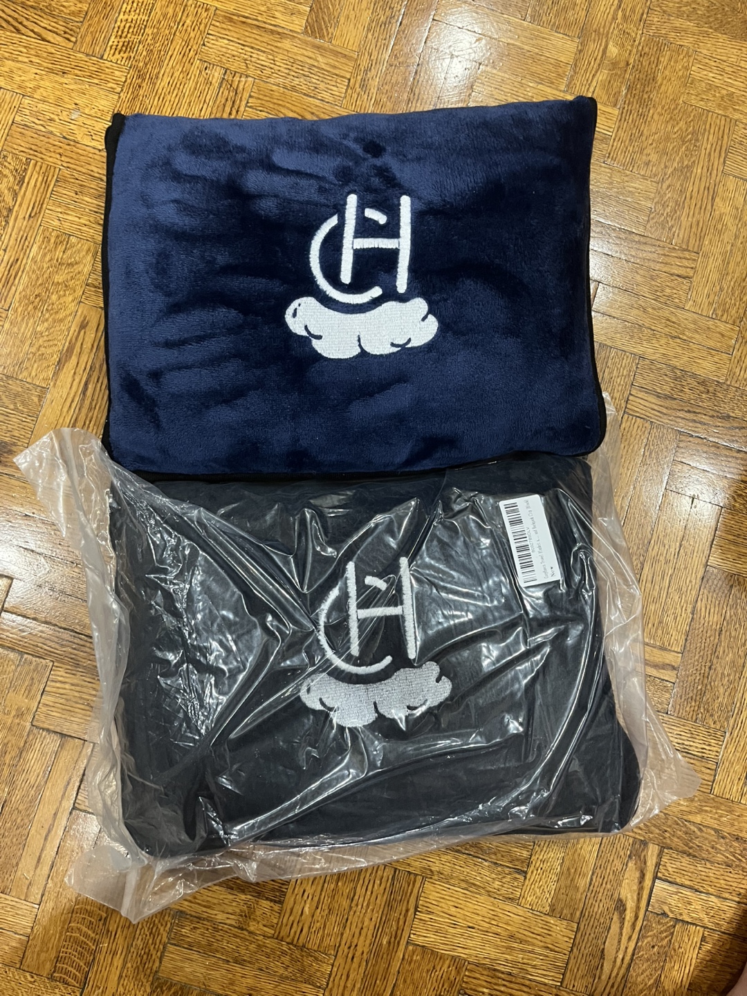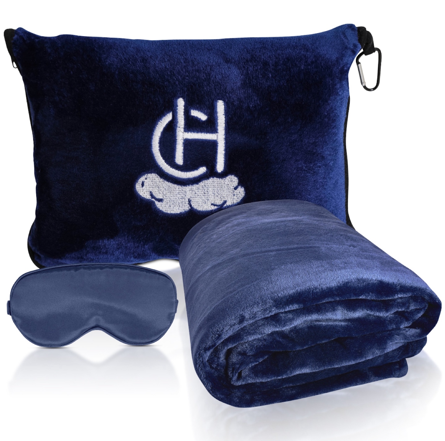 - 3-in-1 set includes a blanket, eye mask, and storage bag that doubles as a pillow when blanket is inside