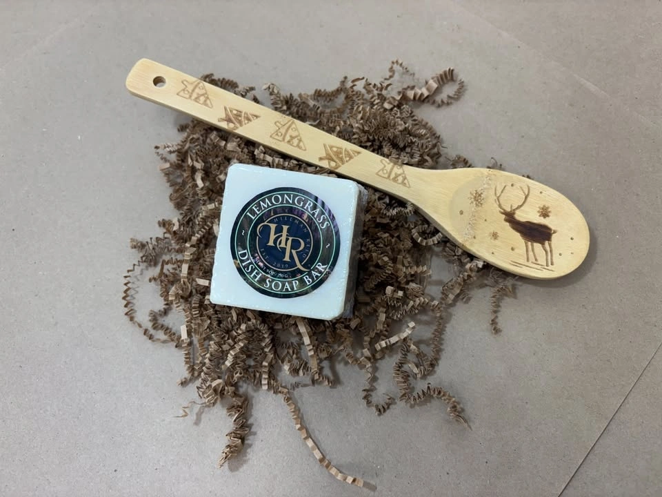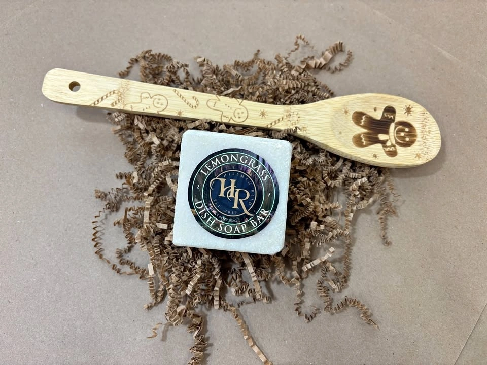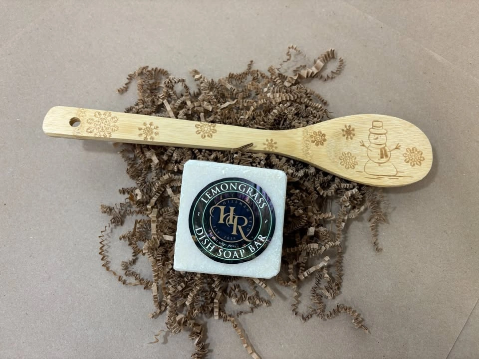 9oz Lemongrass Dish Soap Bar and Wooden spoon (gingerbread man ,snowman, and reindeer) indicate which one you want.