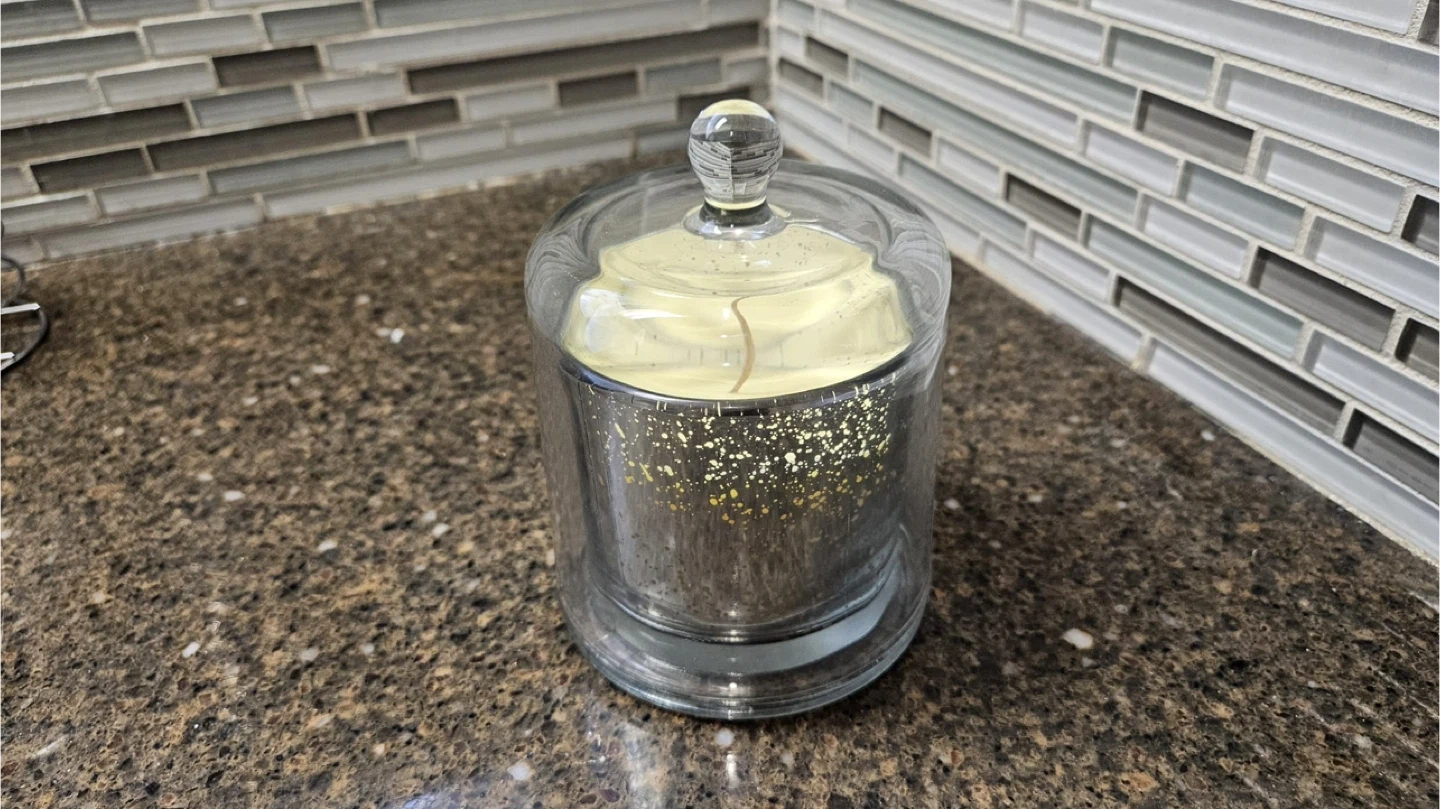 This is a large candle in a decorative glass jar. It has a metallic speckled finish and comes with a clear glass lid topped with a round finial. The candle appears to be a pale yellow colour.