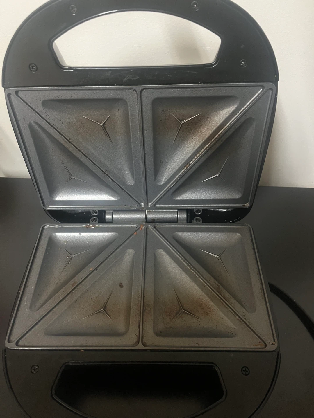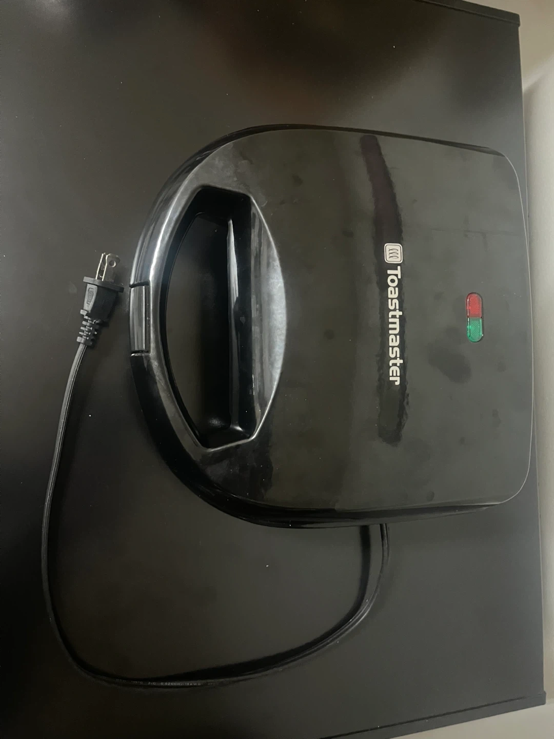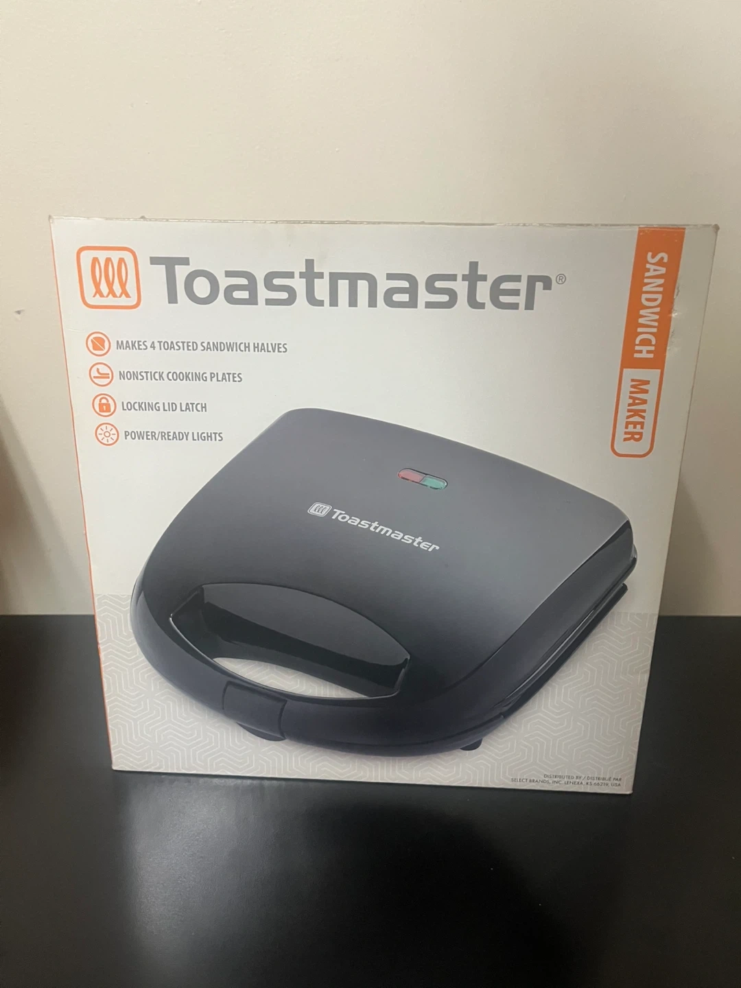 This Toastmaster sandwich maker makes 4 toasted sandwich halves. It features nonstick cooking plates, a locking lid latch, and power/ready lights. Includes non-slip rubber feet for stability. (Works like new)