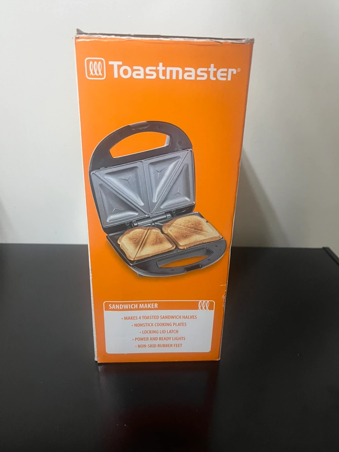 This Toastmaster sandwich maker makes 4 toasted sandwich halves. It features nonstick cooking plates, a locking lid latch, and power/ready lights. Includes non-slip rubber feet for stability. (Works like new)