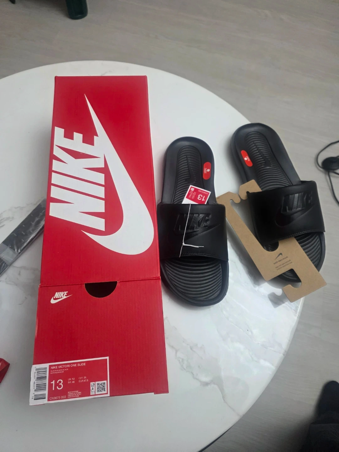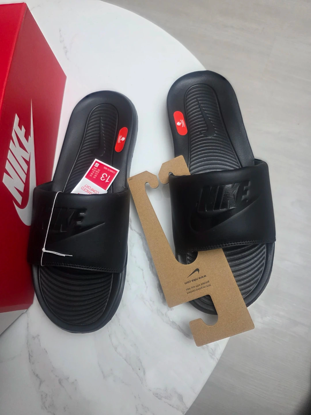 Brand new Nike Victor One slides in black. These are a size 13. They're designed for enhanced comfort and feature a slip-on design. Includes the original box.