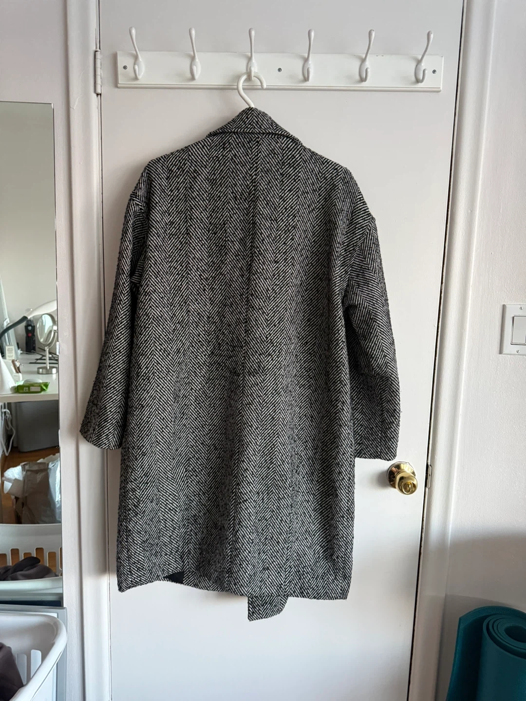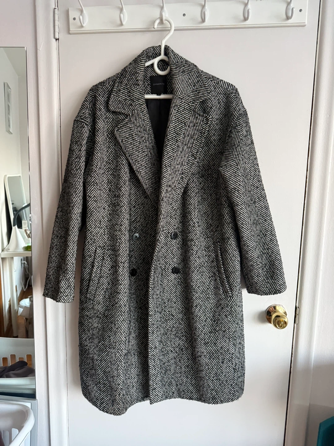 A classic herringbone wool blend coat with a double-breasted closure. This stylish outerwear piece is perfect for layering during colder months. It features a timeless design that's sure to keep you warm and looking sharp.