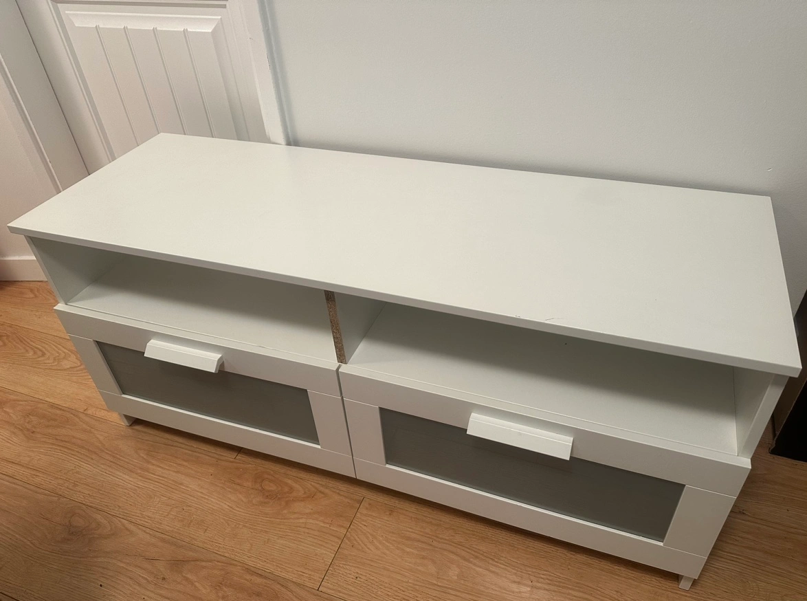 Selling a used like new condition white TV stand with two drawers and a shelf.