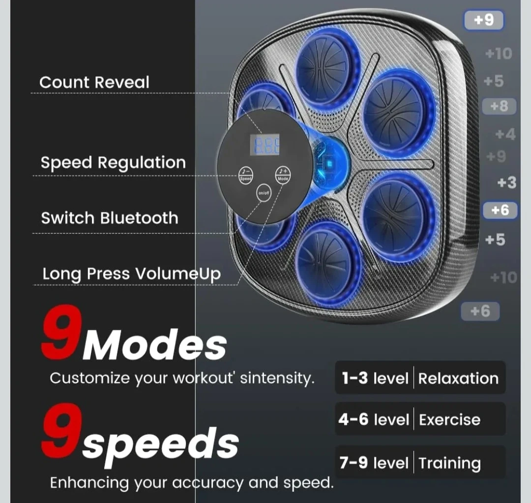 This smart music boxing target lets you exercise rhythmically to your favourite music. It features 9 modes and 9 speeds for customized intensity and accuracy. It's great for all ages looking to workout, relax, or improve coordination!