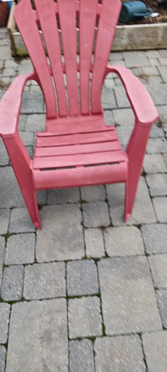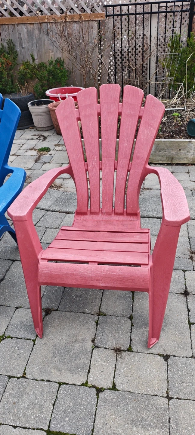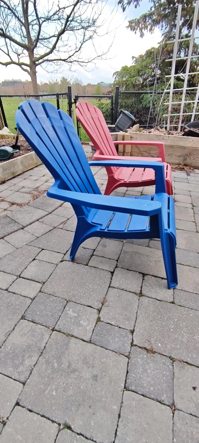 Two classic Adirondack chairs, one in blue and one in red. Made from durable plastic for outdoor use. These chairs offer a comfy spot to relax on your patio or in the garden.