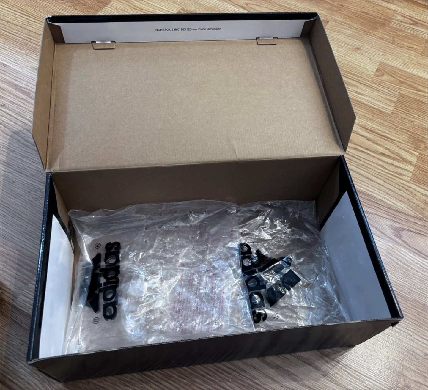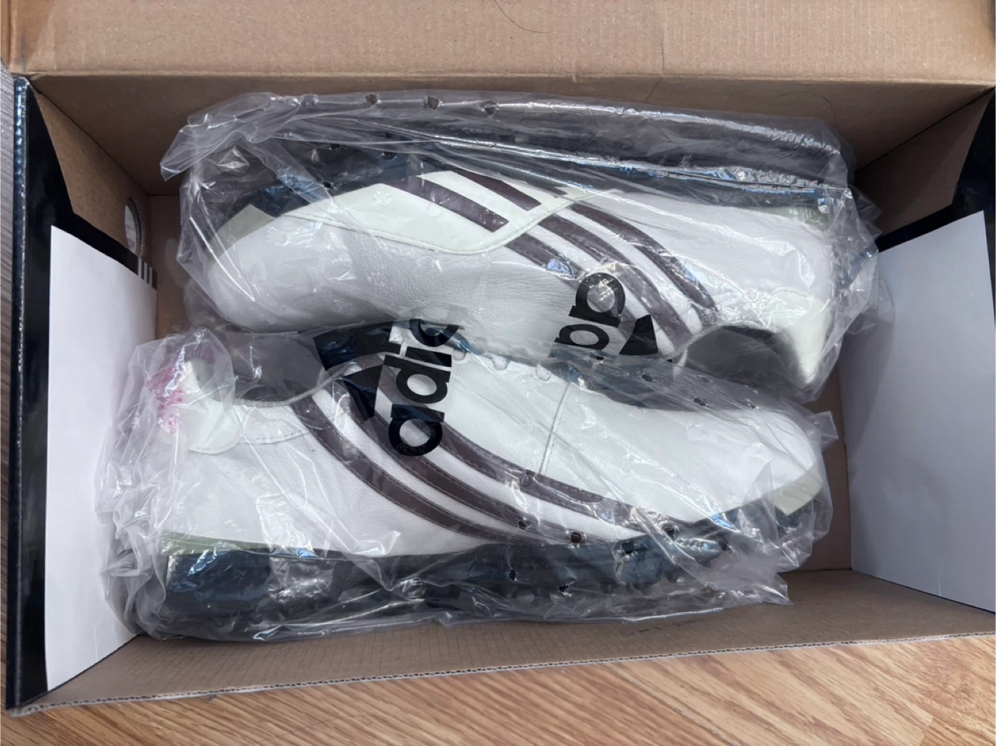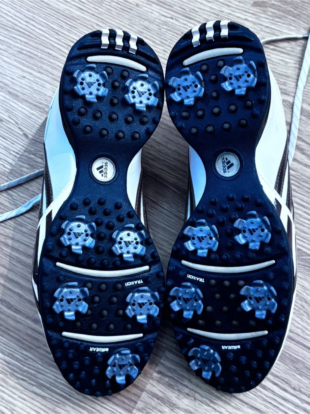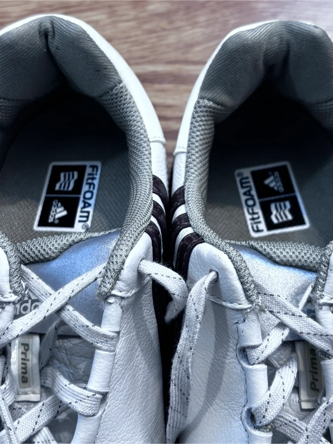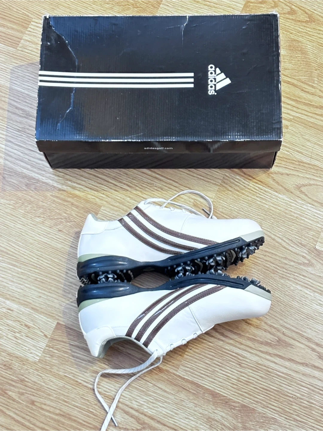 White and brown leather Adidas golf shoes with FitFOAM insoles. Includes original box. Fits smaller like a men’s 8 to 8 1/2 or women’s 9 1/2.