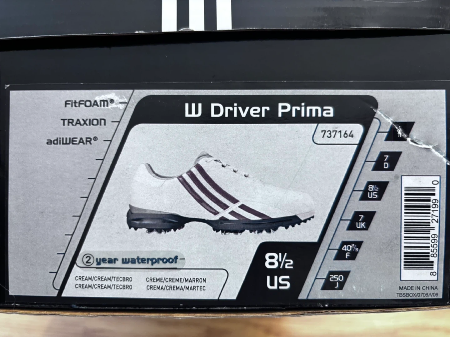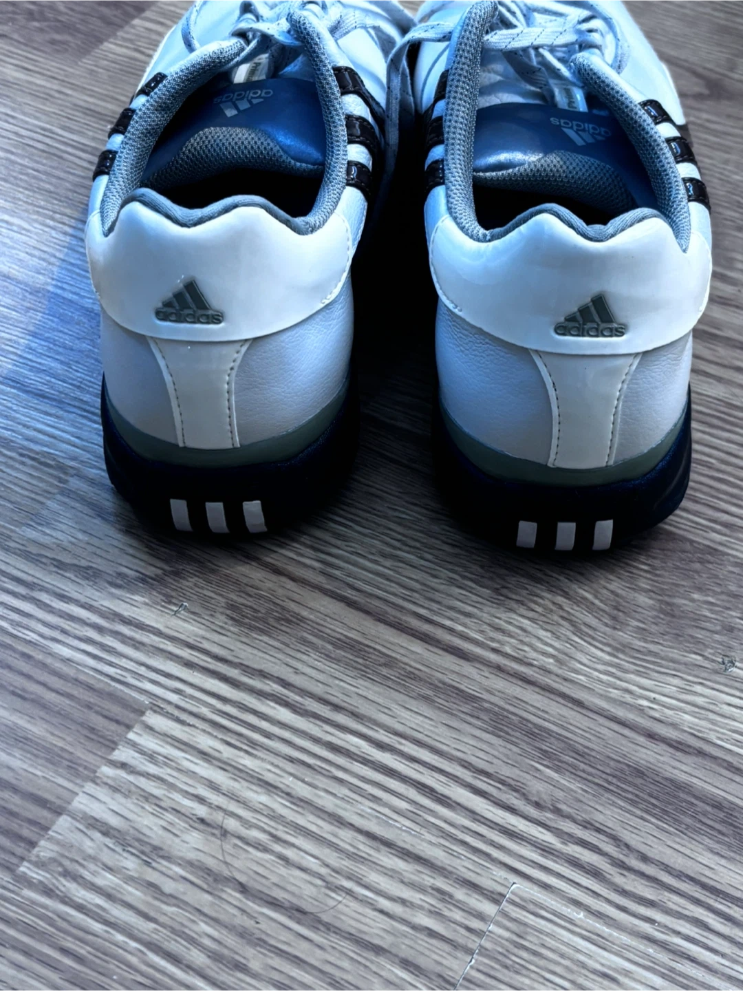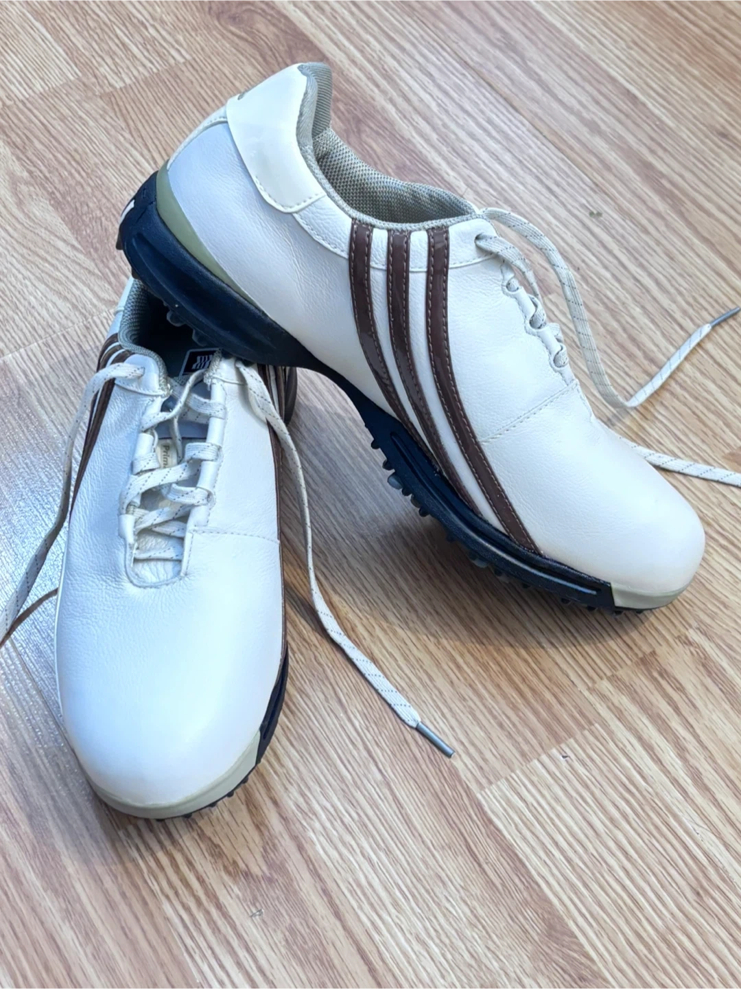White and brown leather Adidas golf shoes with FitFOAM insoles. Includes original box. Fits smaller like a men’s 8 to 8 1/2 or women’s 9 1/2.