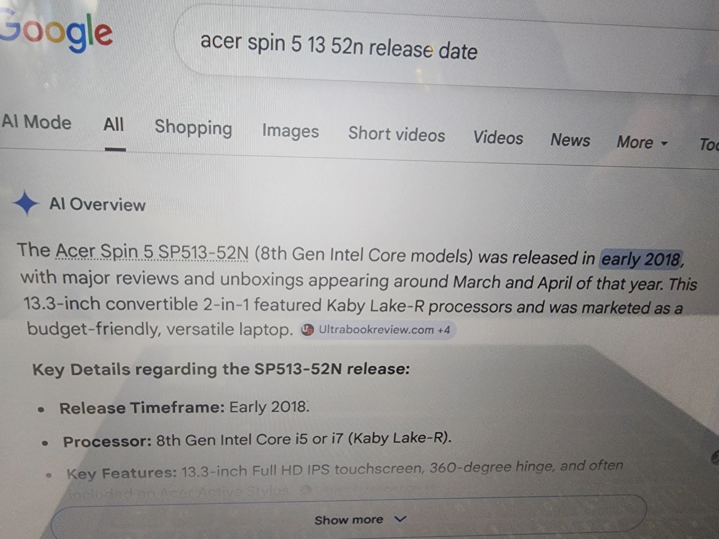 Intel Core i5-8250U processor with 8GB RAM and 256GB SSD. It's a 13-inch convertible 2-in-1 laptop with a touchscreen. Released in early 2022