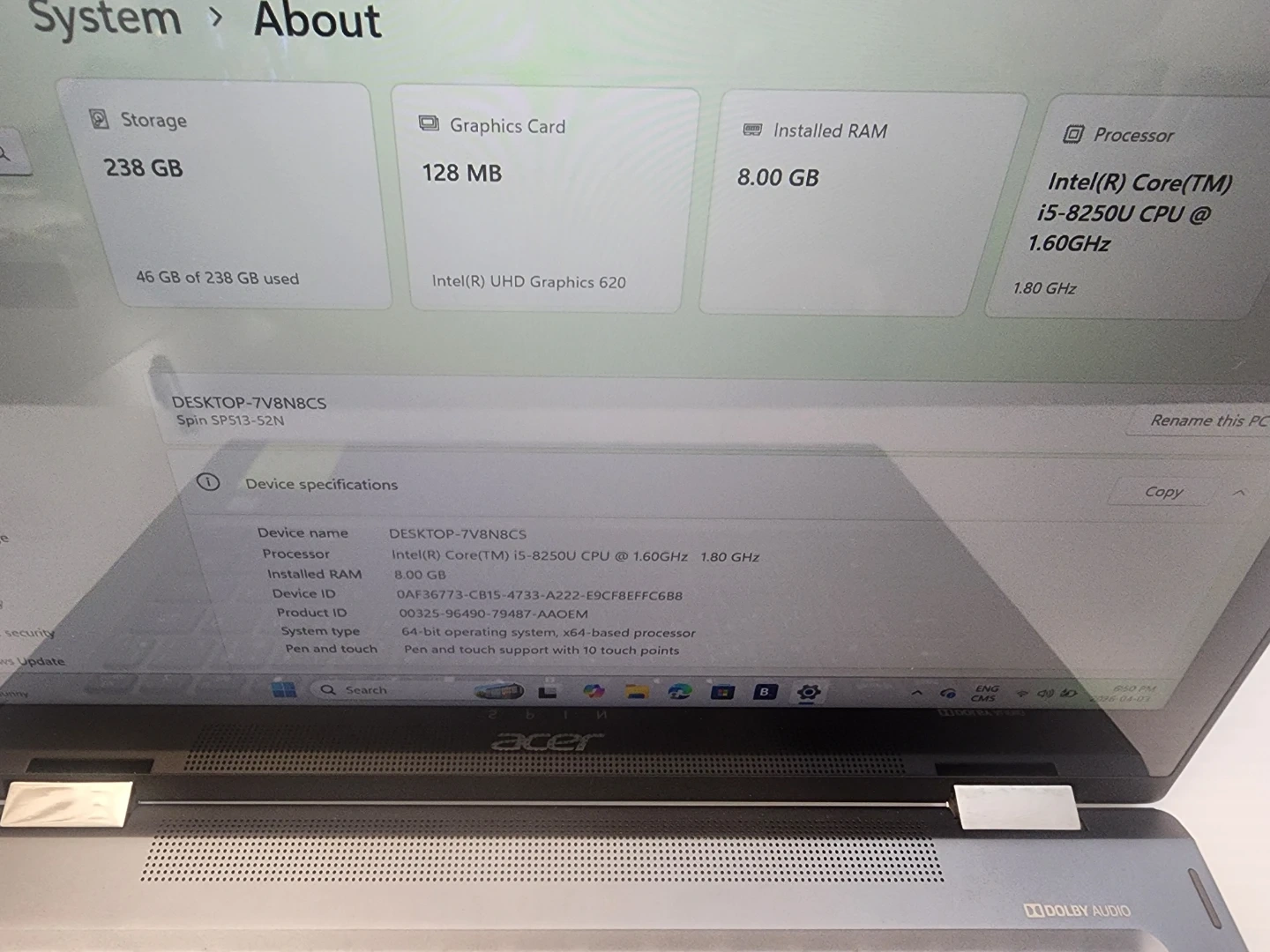 Intel Core i5-8250U processor with 8GB RAM and 256GB SSD. It's a 13-inch convertible 2-in-1 laptop with a touchscreen. Released in early 2022