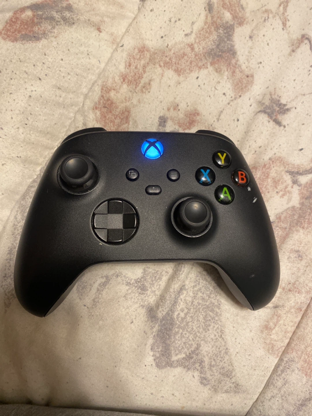 This is a black Xbox Wireless Controller. It features standard button layout with analog sticks and a directional pad. The controller's Xbox button glows blue when powered on.