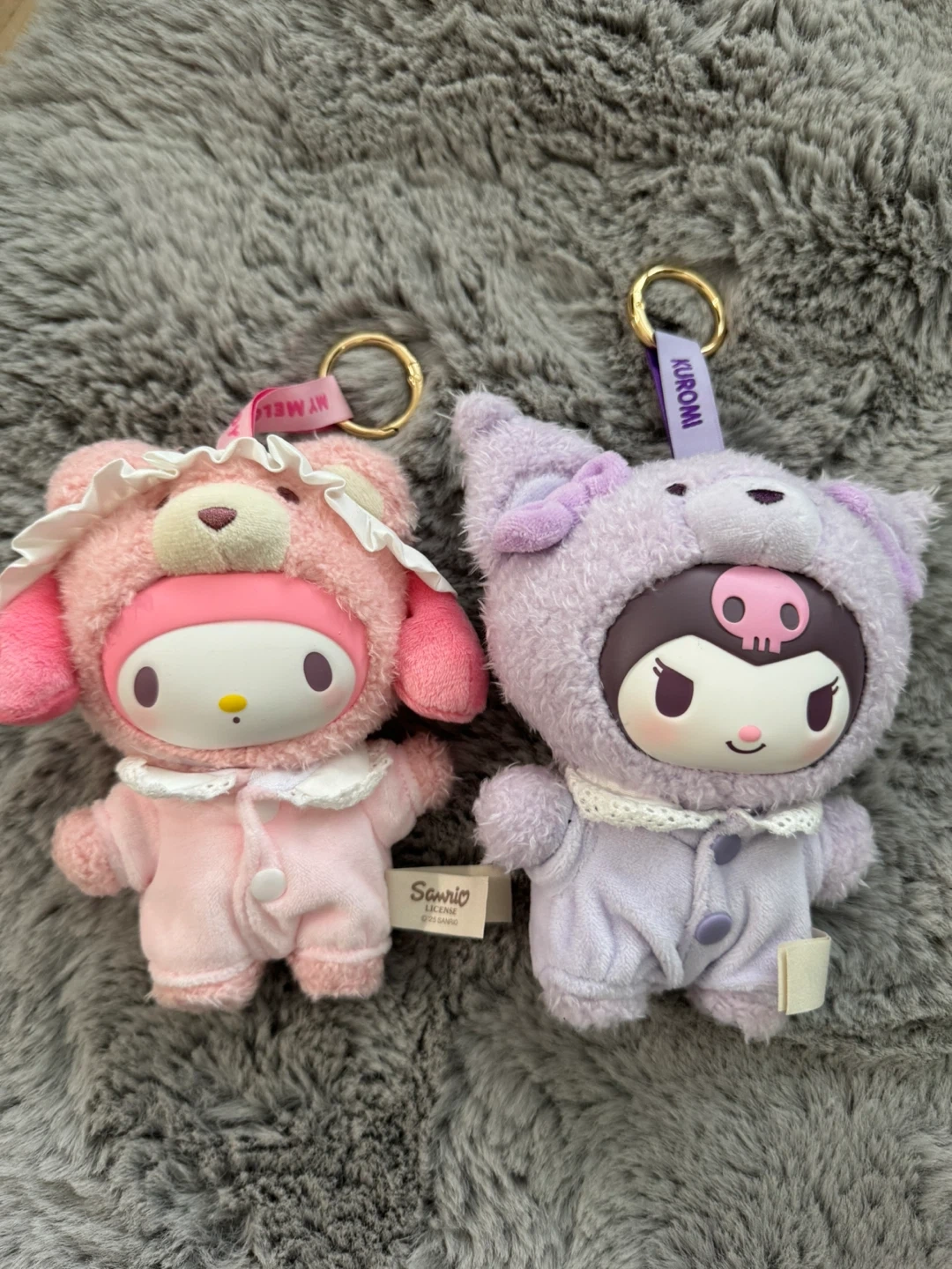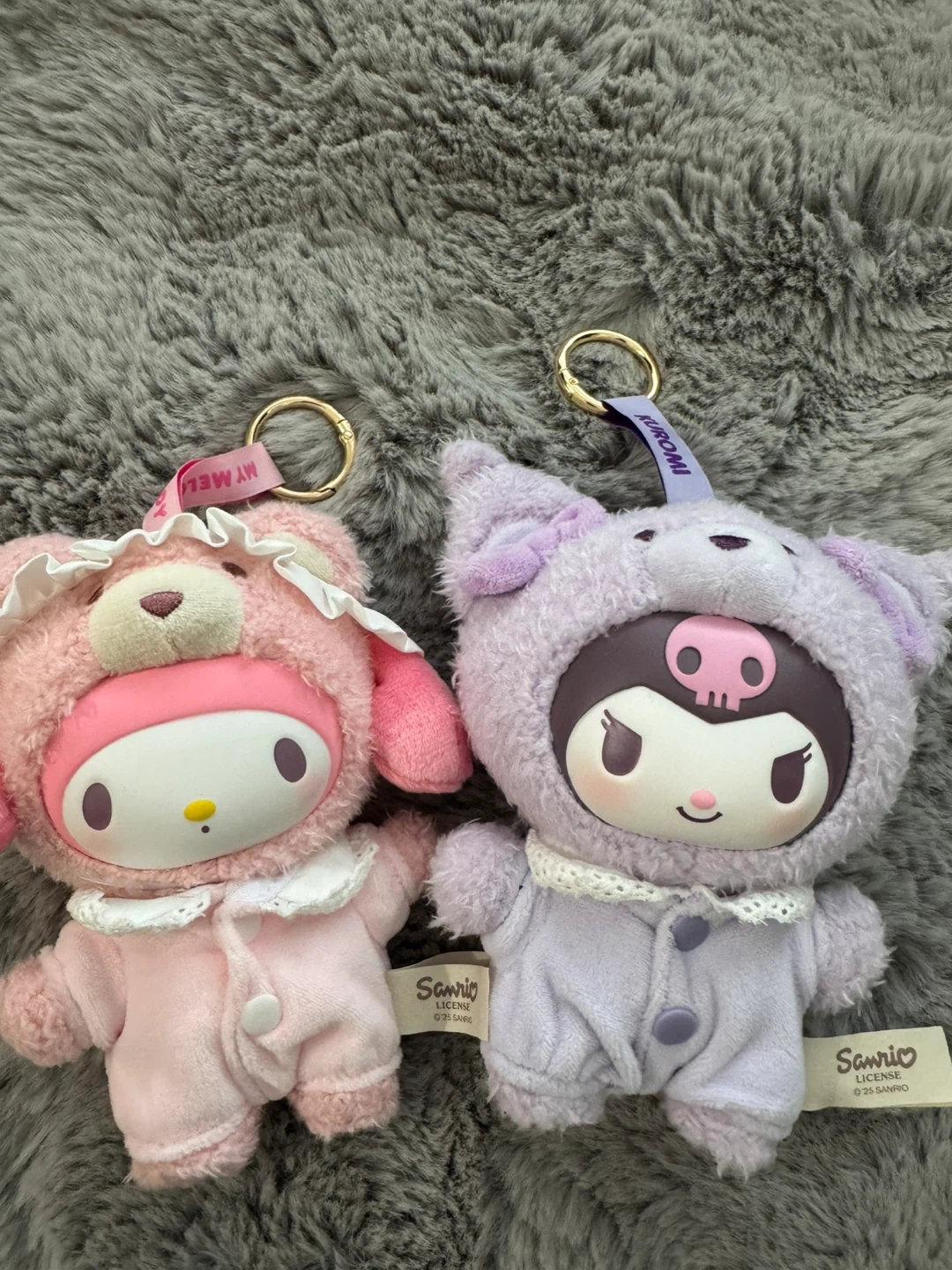 Cute Sanrio plush keychains featuring My Melody and Kuromi. Both are wearing adorable sleepwear outfits and come with metal keyring attachments.