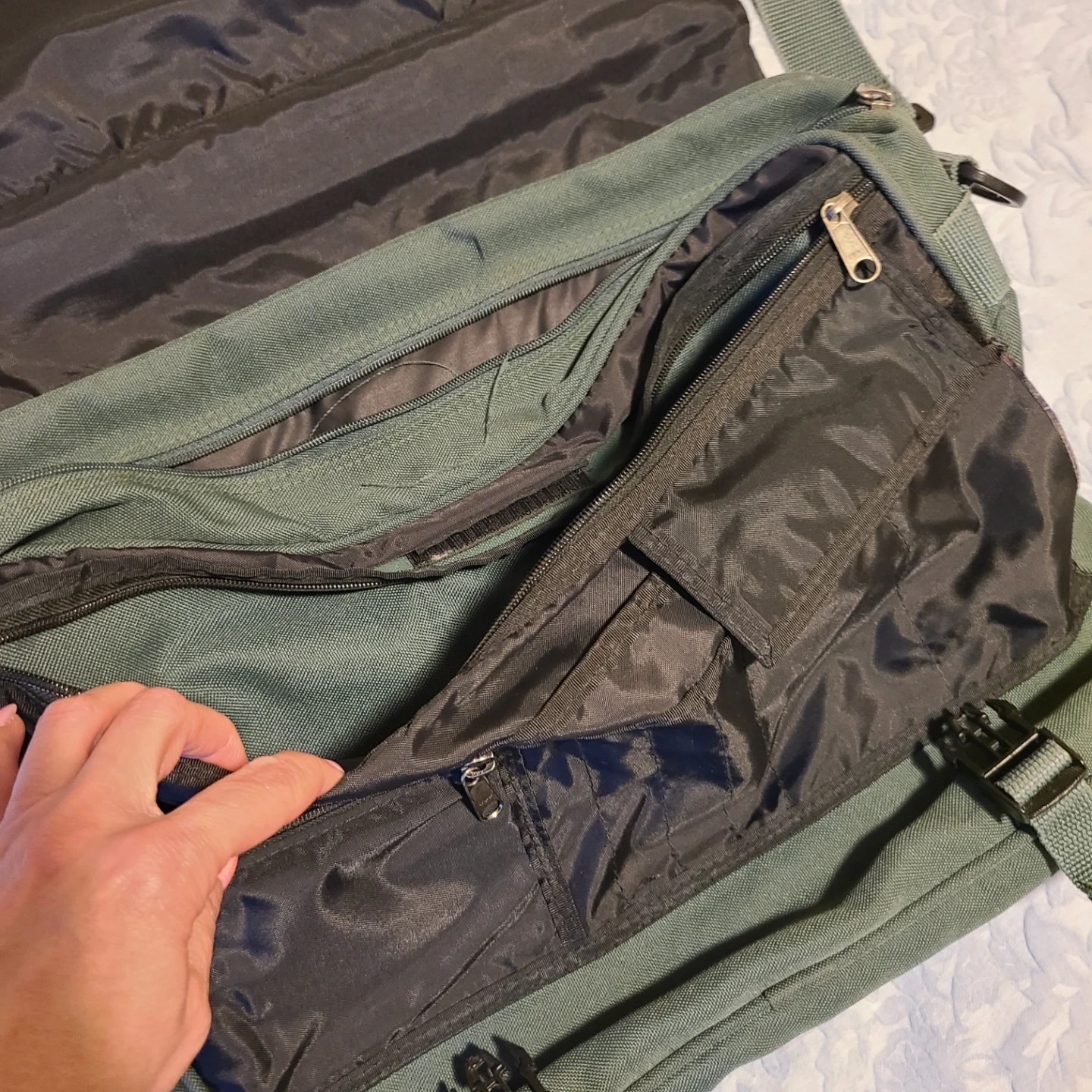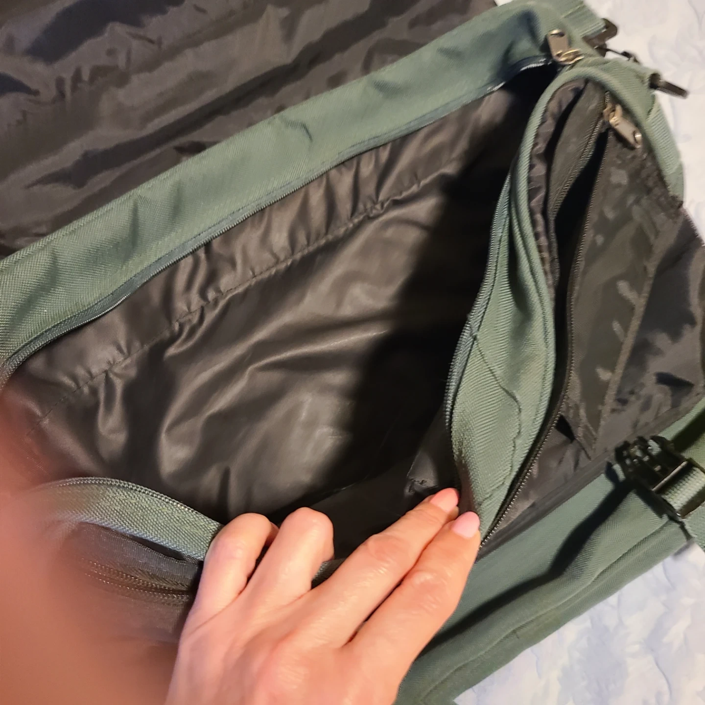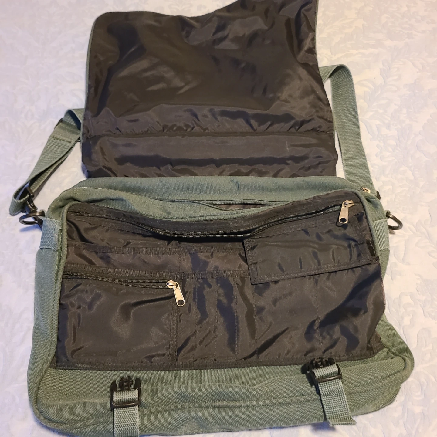 This green messenger bag is made of durable canvas. It has a main compartment with zippered pockets and an adjustable shoulder strap. Great for carrying books or a laptop.