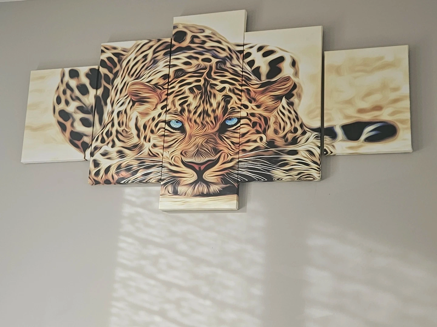 This stunning five-piece canvas art features a dramatic close-up of a leopard with striking blue eyes. The set provides a modern, multi-panel display for your wall. Canvas material.