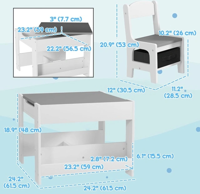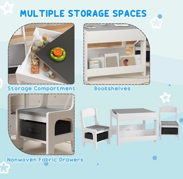 This Qaba 3-piece kids table and chair set, designed in a modern style, includes a table and two chairs, perfect for any child's bedroom or playroom. The set features multiple storage spaces to keep books and toys organized, making it an ideal spot for playtime, homework, or arts and crafts. It's brand new and ready to assemble!