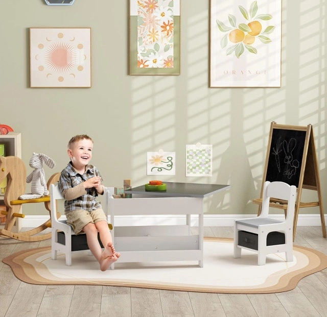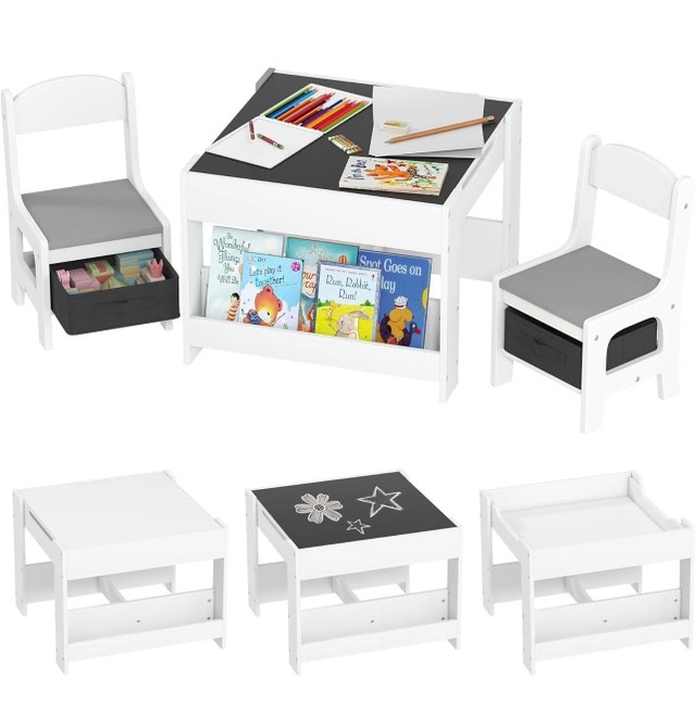 This Qaba 3-piece kids table and chair set, designed in a modern style, includes a table and two chairs, perfect for any child's bedroom or playroom. The set features multiple storage spaces to keep books and toys organized, making it an ideal spot for playtime, homework, or arts and crafts. It's brand new and ready to assemble!