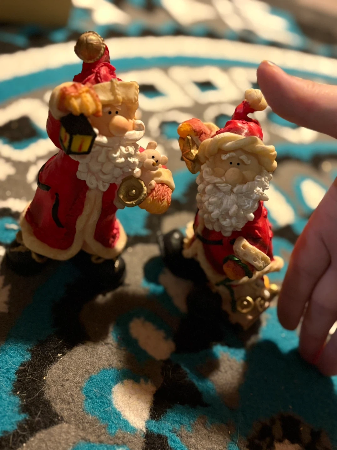 Two decorative Santa Claus figurines. Each Santa is dressed in his classic red suit and hat. One holds a lantern and a small pig, while the other holds a basket. They are ready to add some holiday cheer to your home!