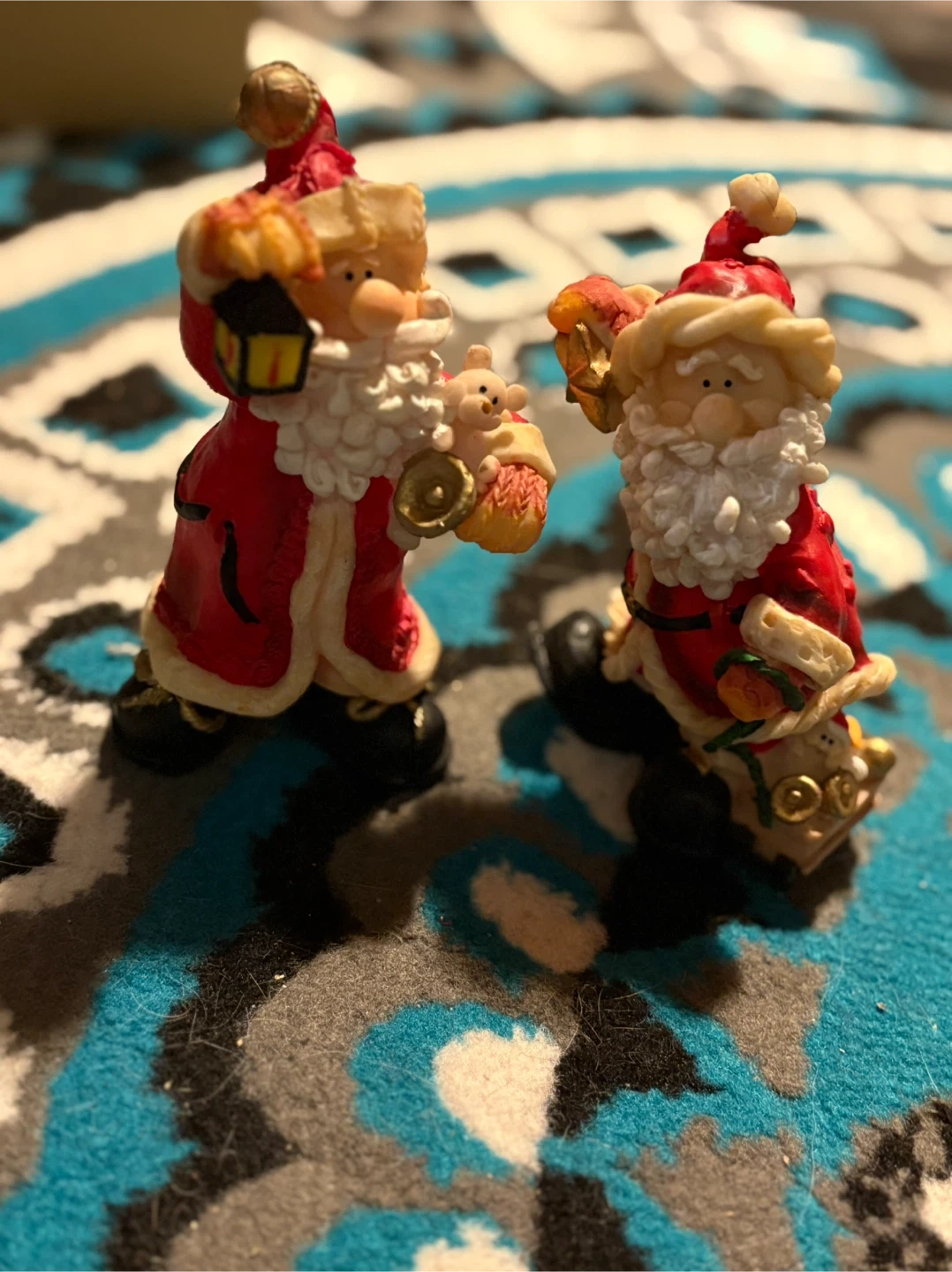 Two decorative Santa Claus figurines. Each Santa is dressed in his classic red suit and hat. One holds a lantern and a small pig, while the other holds a basket. They are ready to add some holiday cheer to your home!