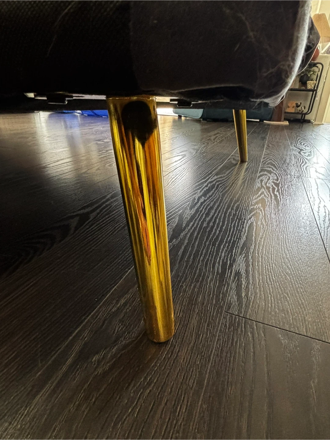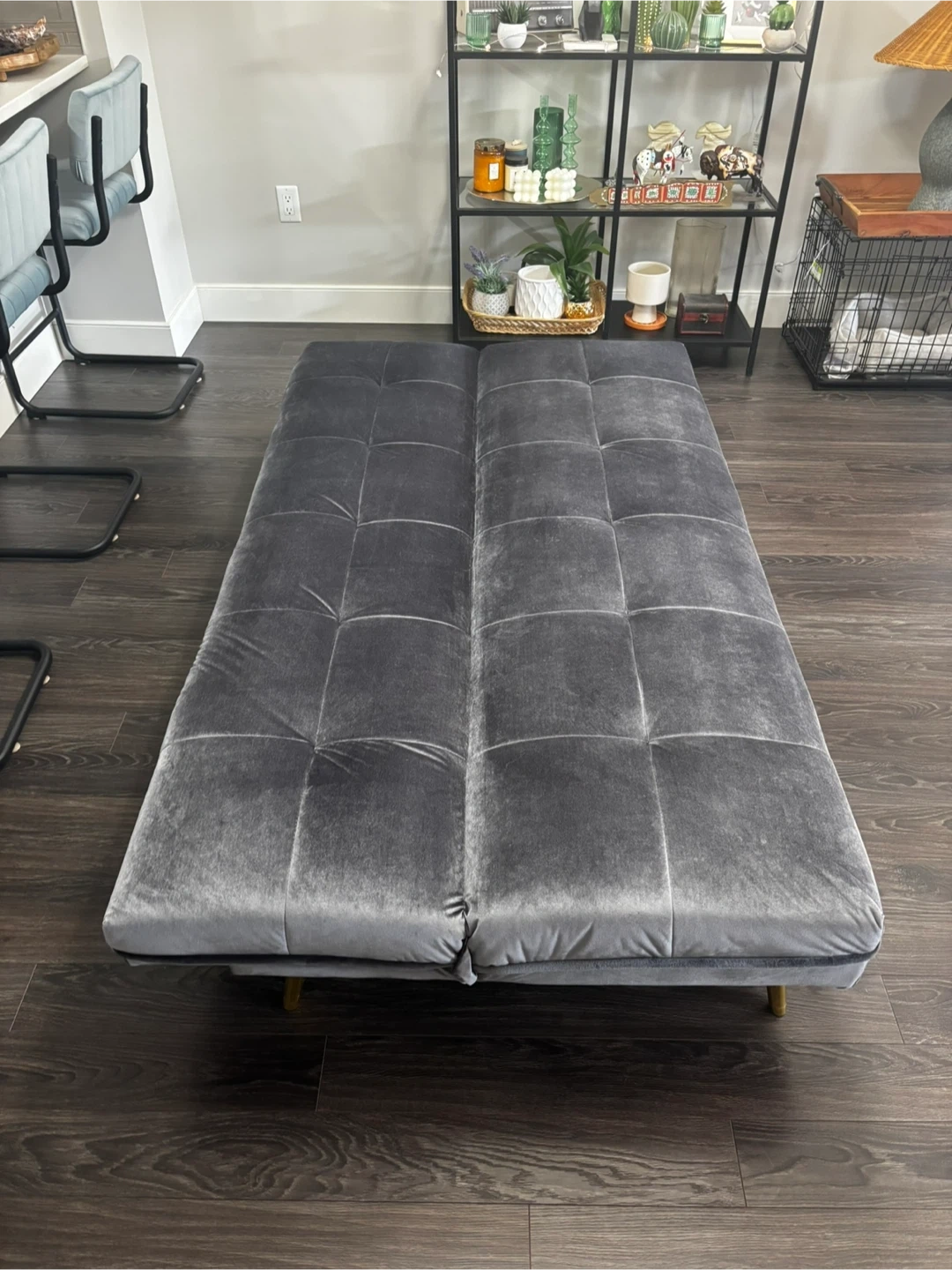 This grey velvet loveseat sofa bed features stylish tufted cushions and gold-toned legs. It's designed for comfort and convenience, easily converting from a sofa to a bed. Great for small spaces or guest rooms!
