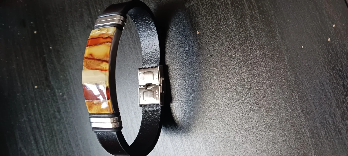 This bracelet features a black leather band with a decorative inlay of natural stones in earthy tones. It's secured with a stainless steel clasp. A stylish accessory for everyday wear!