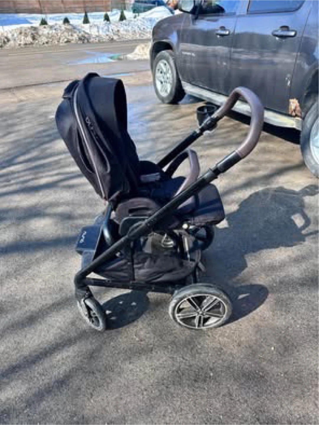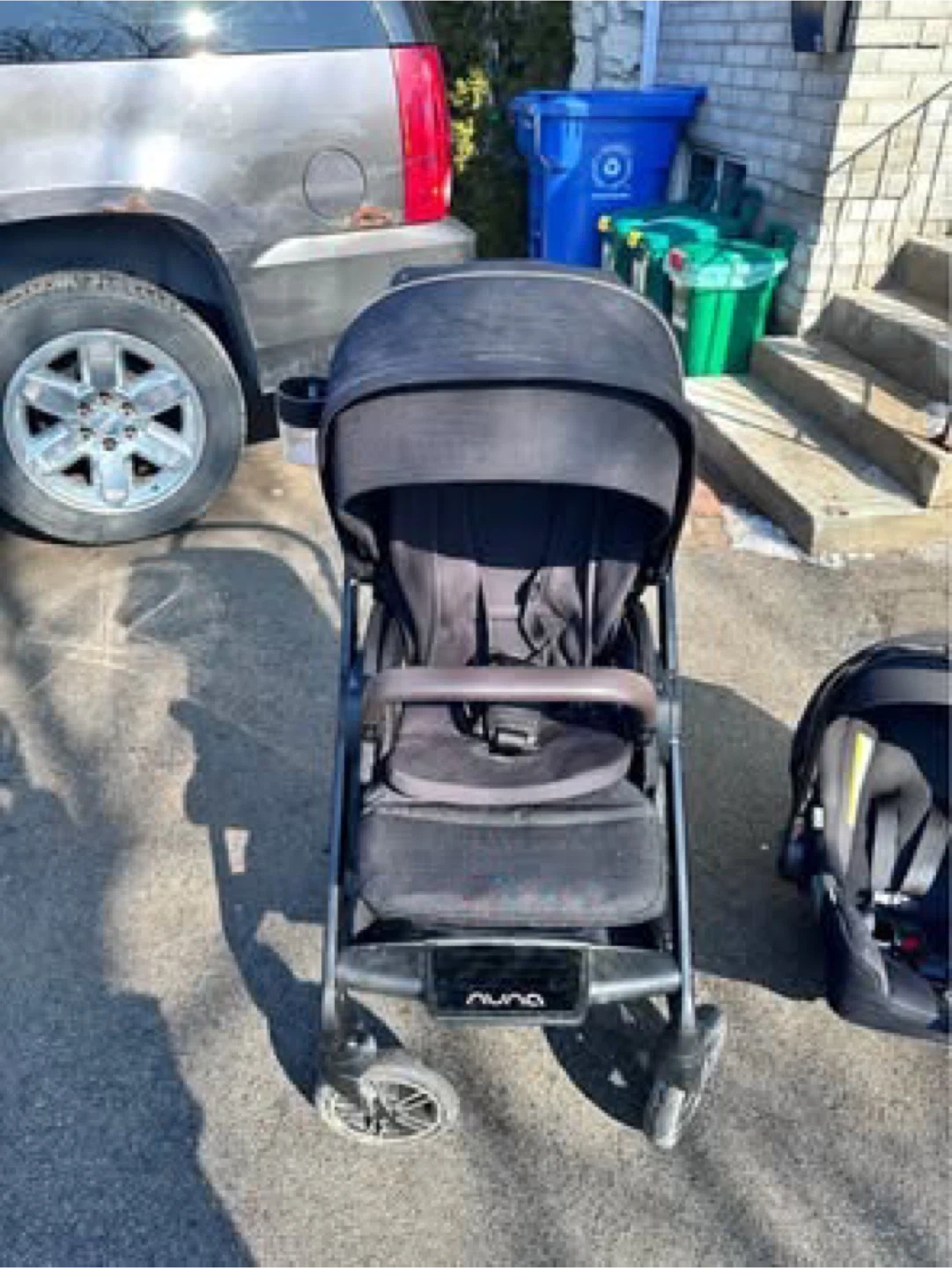 This is a Nuna Mixx stroller with a Nuna Pipa car seat. Both are black and in good condition. The stroller has a canopy and cup holder.