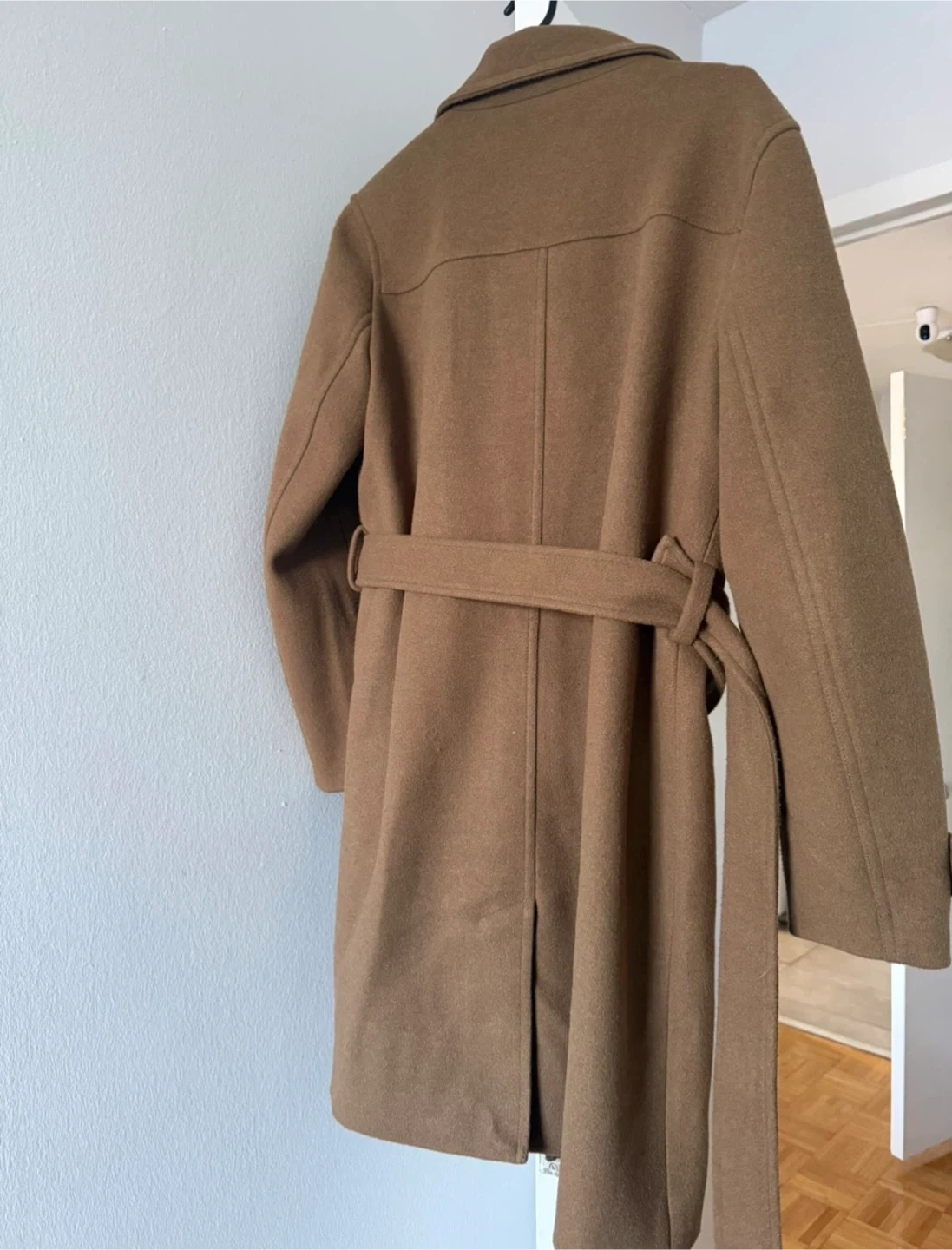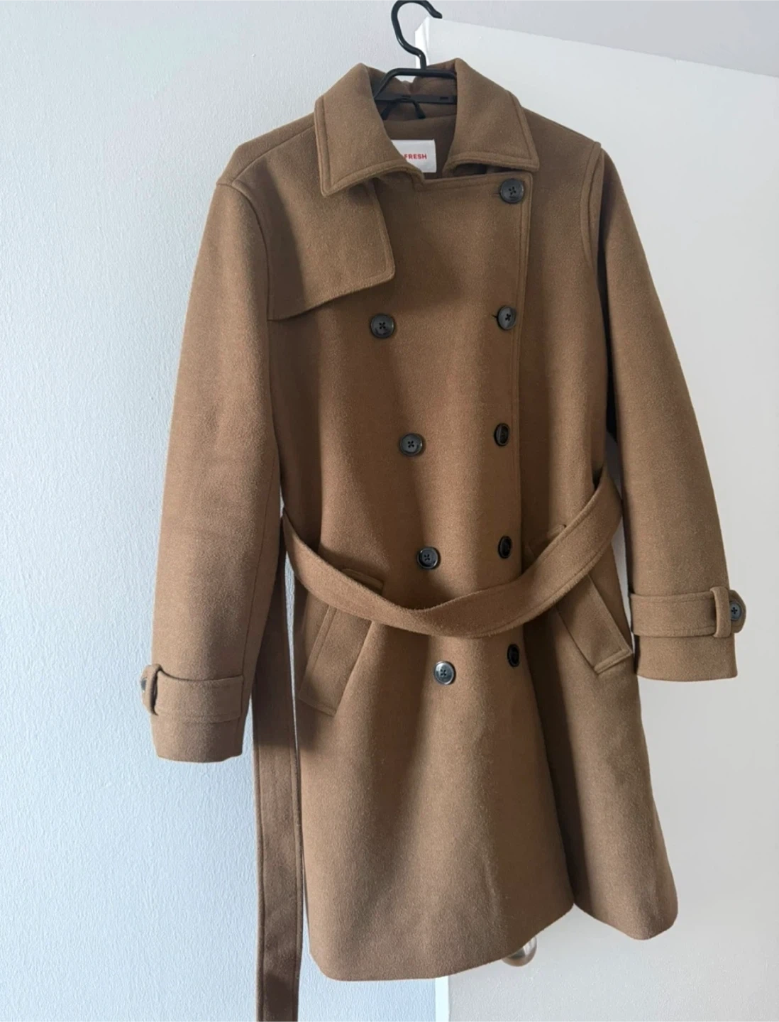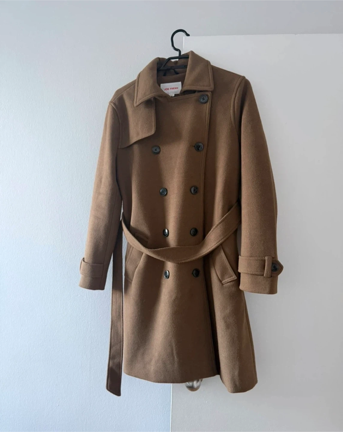 A stylish double-breasted coat from Joe Fresh in a rich brown colour. It's made with a wool blend fabric, perfect for cooler weather. This coat features a belted waist for a cinched look. It includes button closure and a classic lapel design.