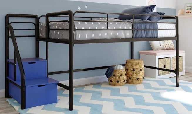 This GREY metal loft bed is a junior twin size. It comes with built-in storage steps. The overall dimensions are 92.5in W x 41.5in D x 44.5in H. It's perfect for smaller rooms or creating extra space!