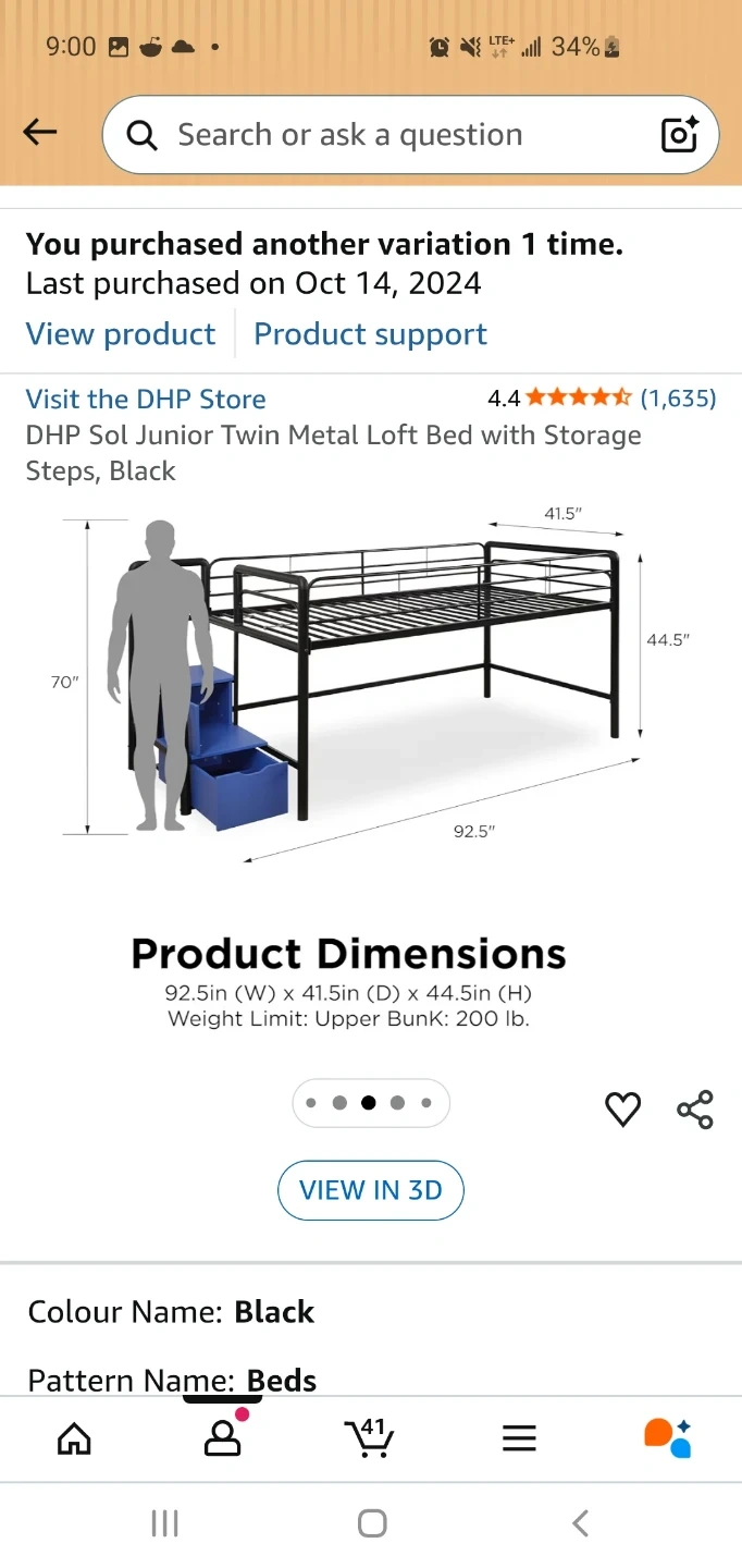 This GREY metal loft bed is a junior twin size. It comes with built-in storage steps. The overall dimensions are 92.5in W x 41.5in D x 44.5in H. It's perfect for smaller rooms or creating extra space!