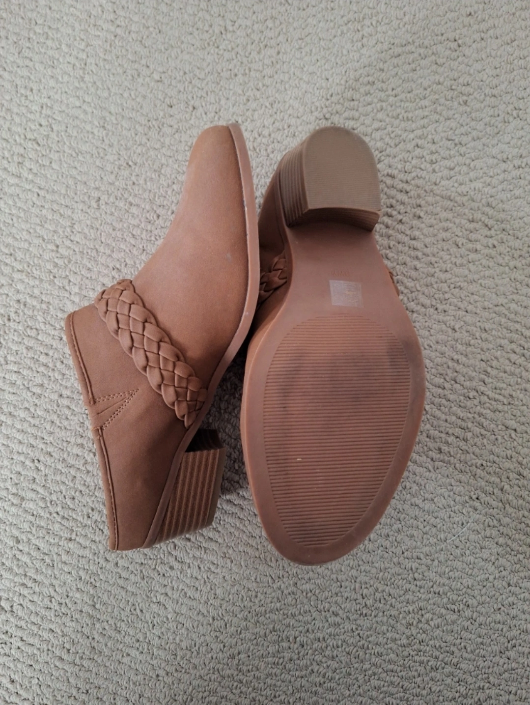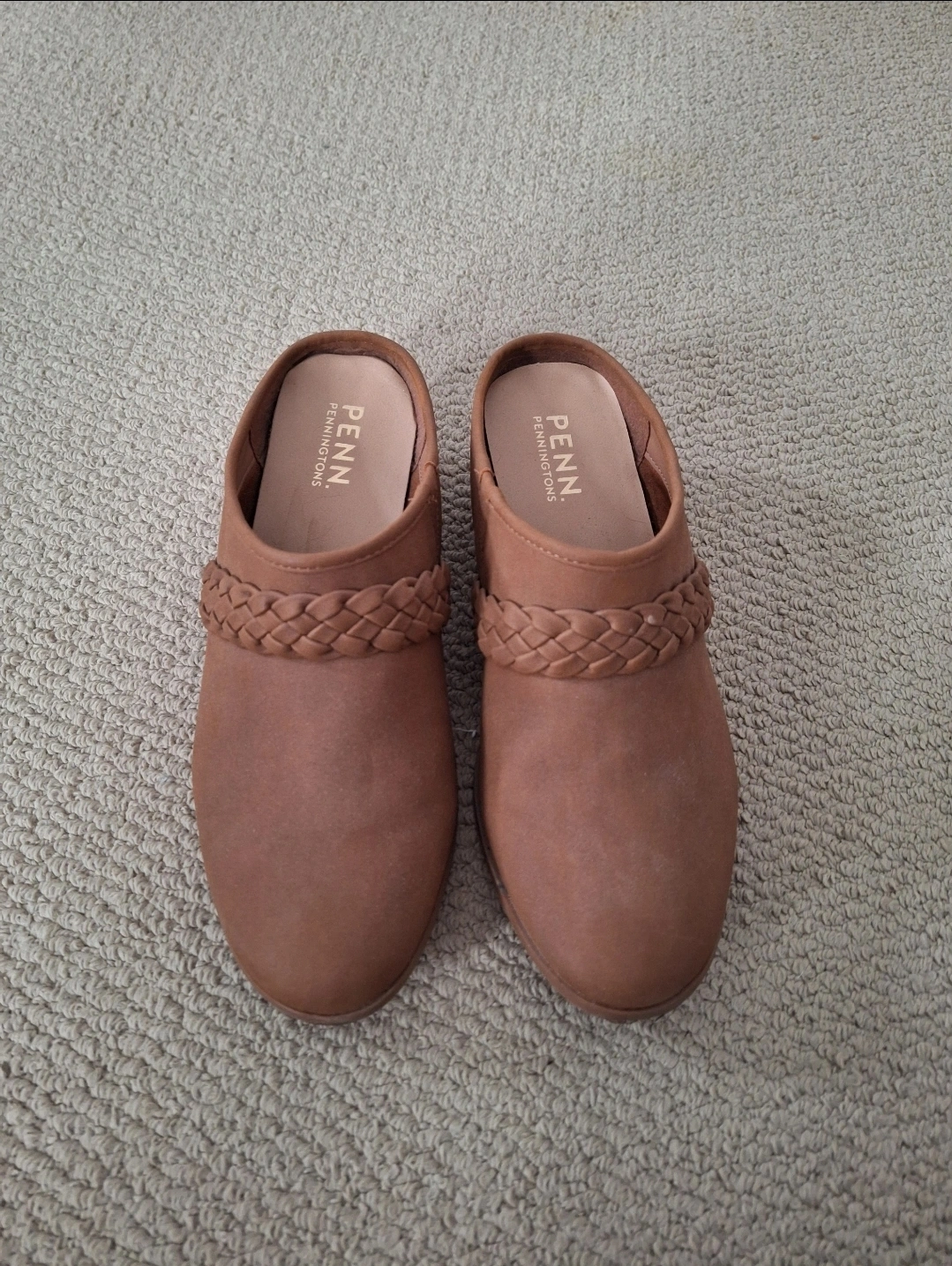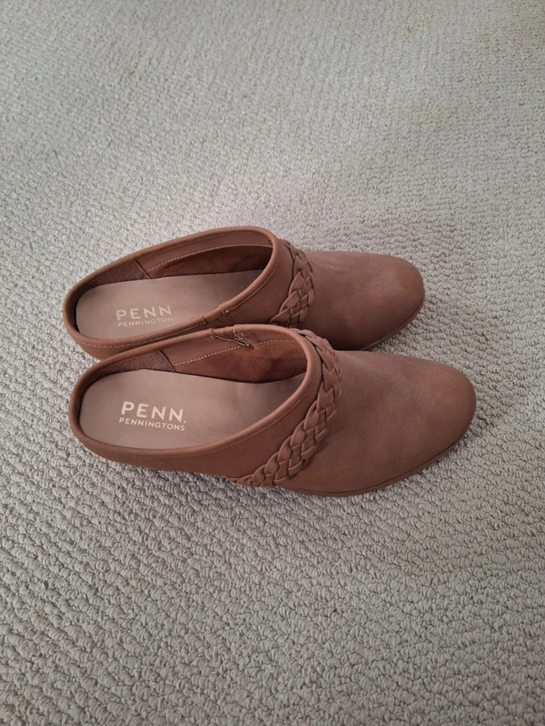 Lightly worn brown faux suede mules. Braided detail. Low block heel. Comfortable and stylish. Wide width size 11.