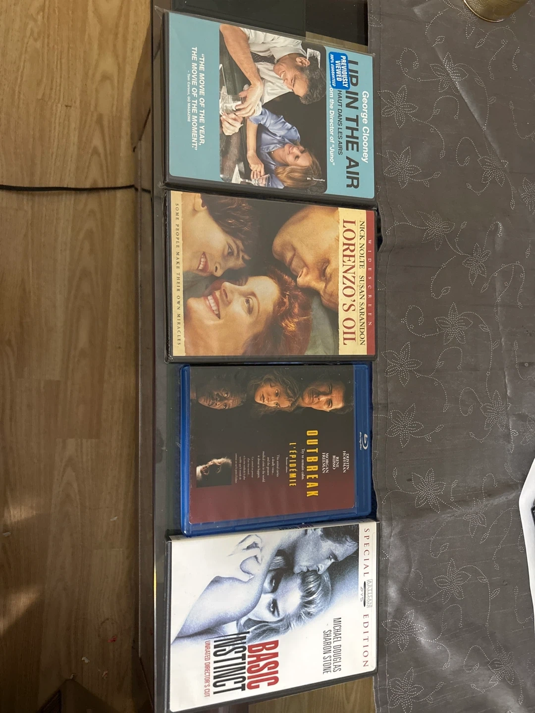 5Selling a bundle of four DVDs! Includes: - Up in the Air - Lorenzo's Oil - Outbreak - Basic Instinct Different DVD AND BLUE RAY MOVIES Around 250 movies Prices between $5 to $20 dollars