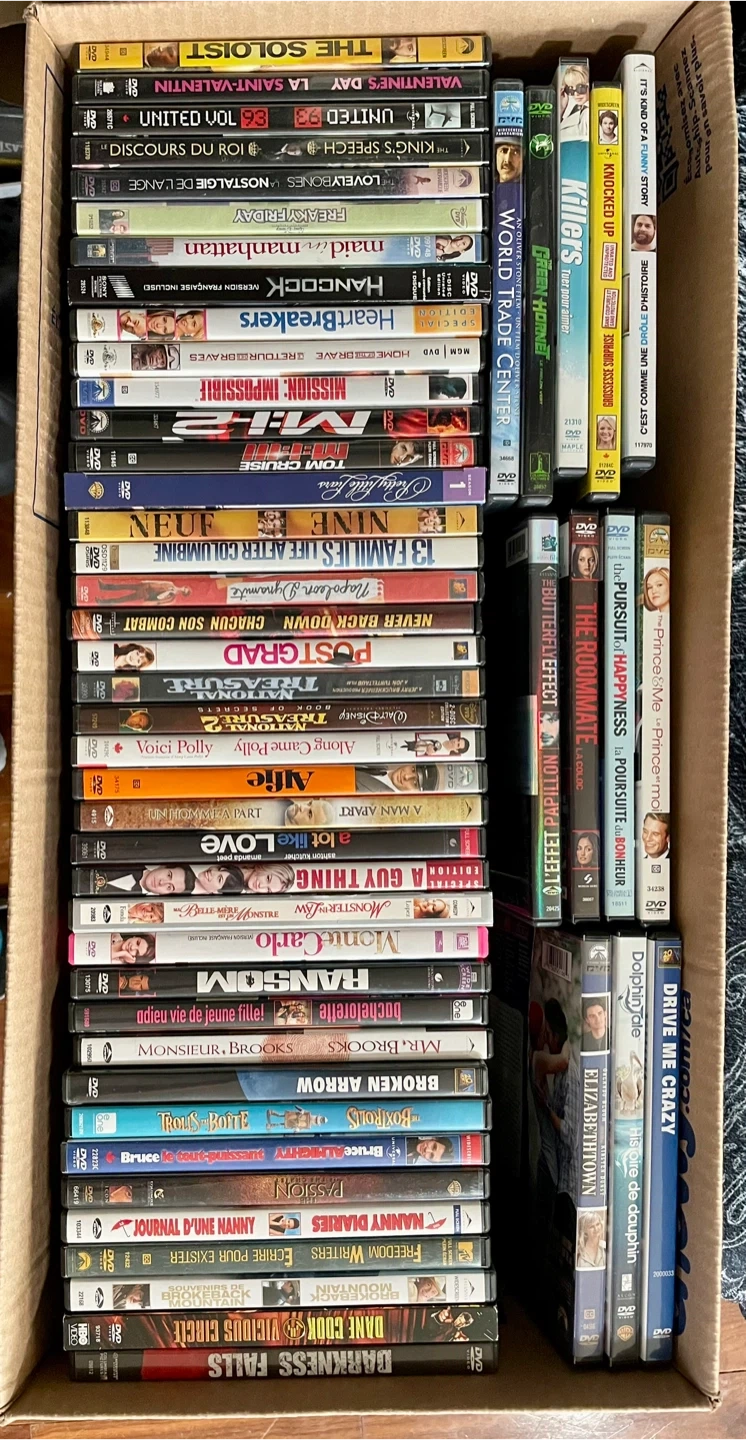 82Dive into a world of cinematic adventures with this DVD lot, featuring 68 movies spanning various genres perfect for movie nights or expanding your entertainment collection. Price is OBO :) All DVDs are in like new condition. Movie titles include: * Darkness Falls * Dane Cook Stand Up * The Butterfly Effect * Green Hornet * 300 * The Bone Collector * The Break-Up * Save the Last Dance * Sweeney Todd * Bad Boys 1 & 2 * Mission Impossible 1-3 * Hanock * And many, many more! If the ad's still up, the movies are still available!
