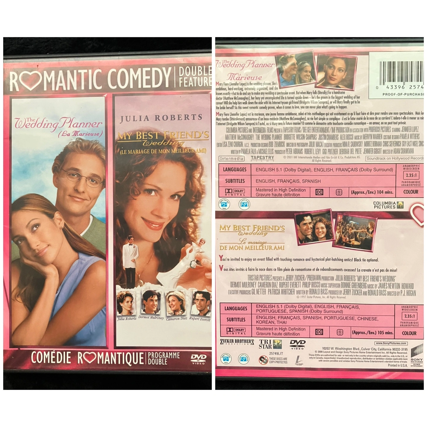 1000+Hi, I am selling a double feature DVD that includes "The Wedding Planner," starring Jennifer Lopez and Matthew McConaughey, and "My Best Friend's Wedding," featuring Julia Roberts, Dermot Mulroney, and Cameron Diaz. Both movies are available in English and French, and they are for pick-up only in Scarborough. Thank you for your interest!