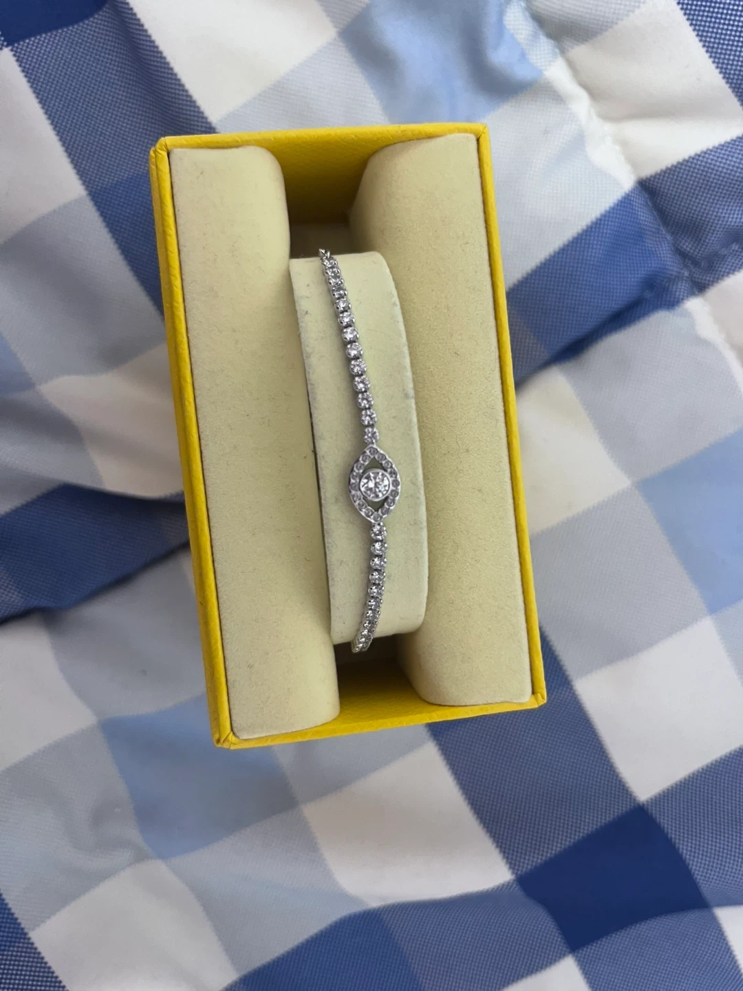 Beautiful elegant silver swarovski bracelet with stones all over. It is adjustable so it’s perfect for anybody and can work well with both a casual and a formal look! It comes with its original box!