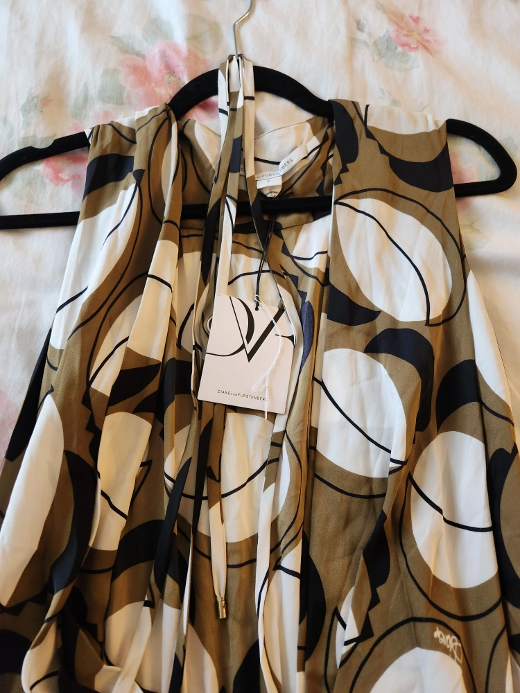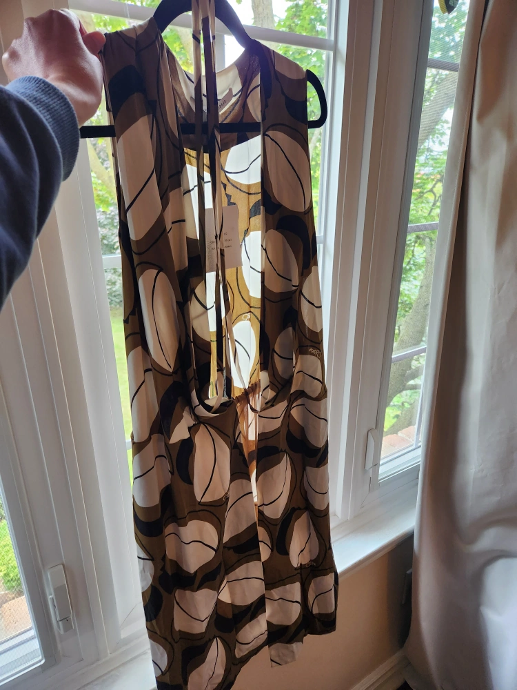 10A beautiful silk dress with a unique pattern. It is sleeveless and has a tie at the neck. The dress is in excellent condition. never worn with Tags intact