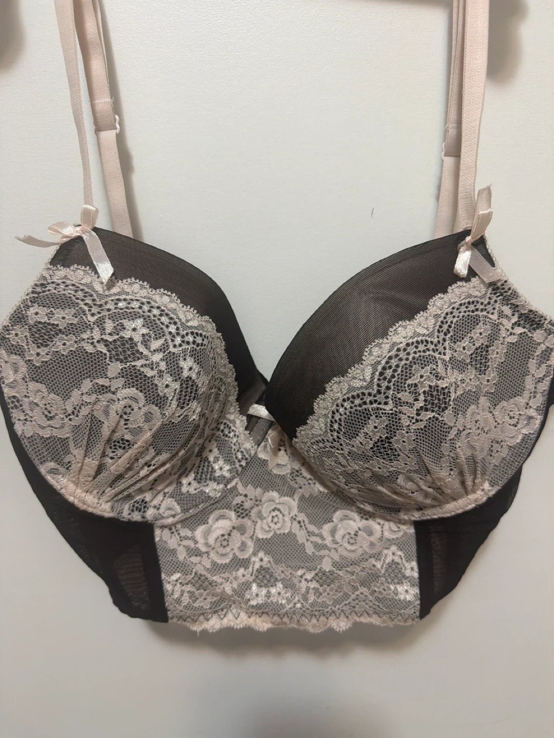 This Sophie B. bra is a size 36B, featuring a black and nude lace design. It's made with 90% polyester, 10% spandex for the body and lace. The underwire and full coverage cups offer support. It has adjustable straps and a back closure.