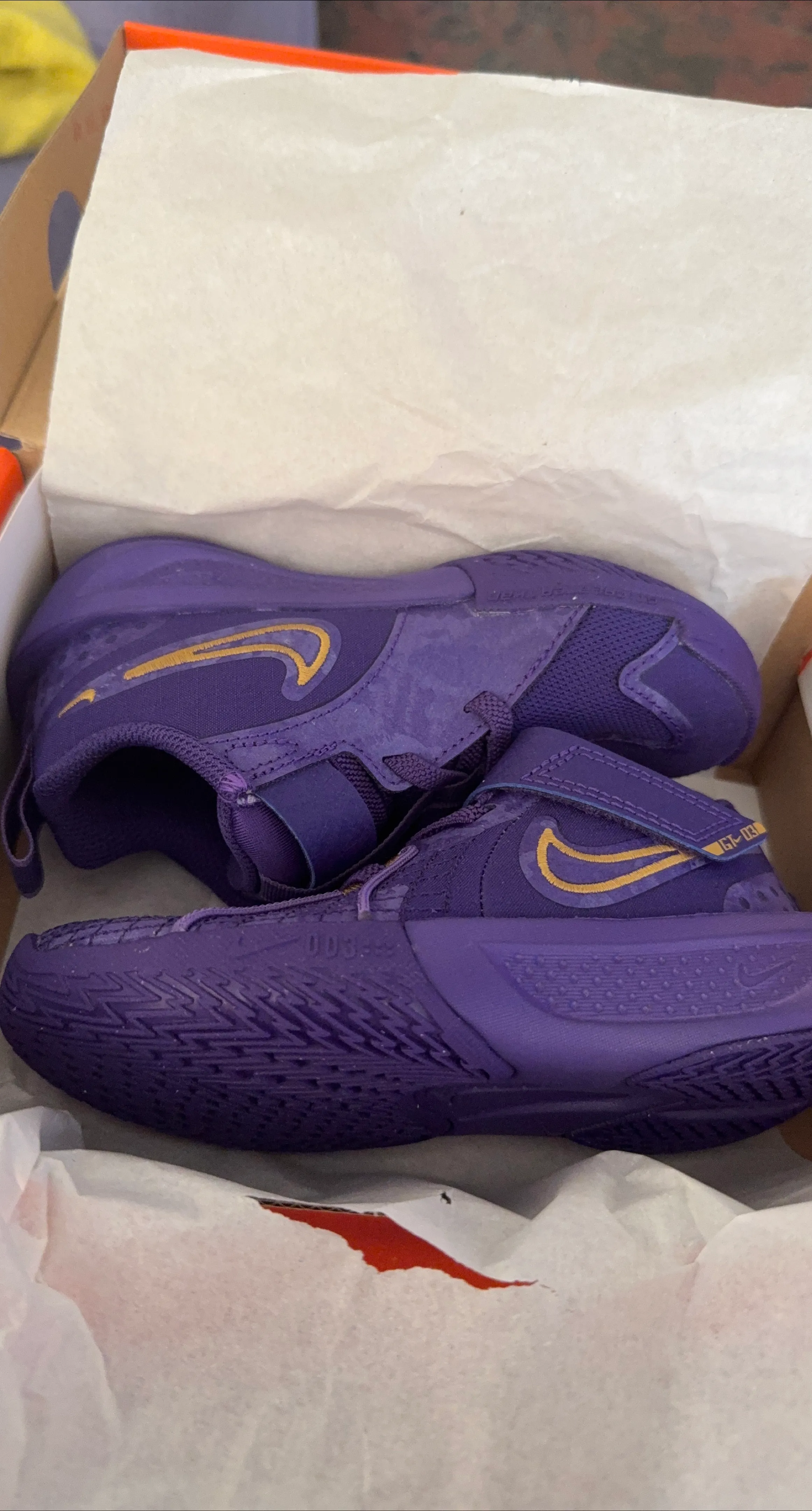 Selling a pair of Nike GT Hustle 2 shoes in a striking purple and gold colorway! These shoes come with the original box, making them perfect for basketball or just rocking a cool look. Never worn, fresh out the box!!